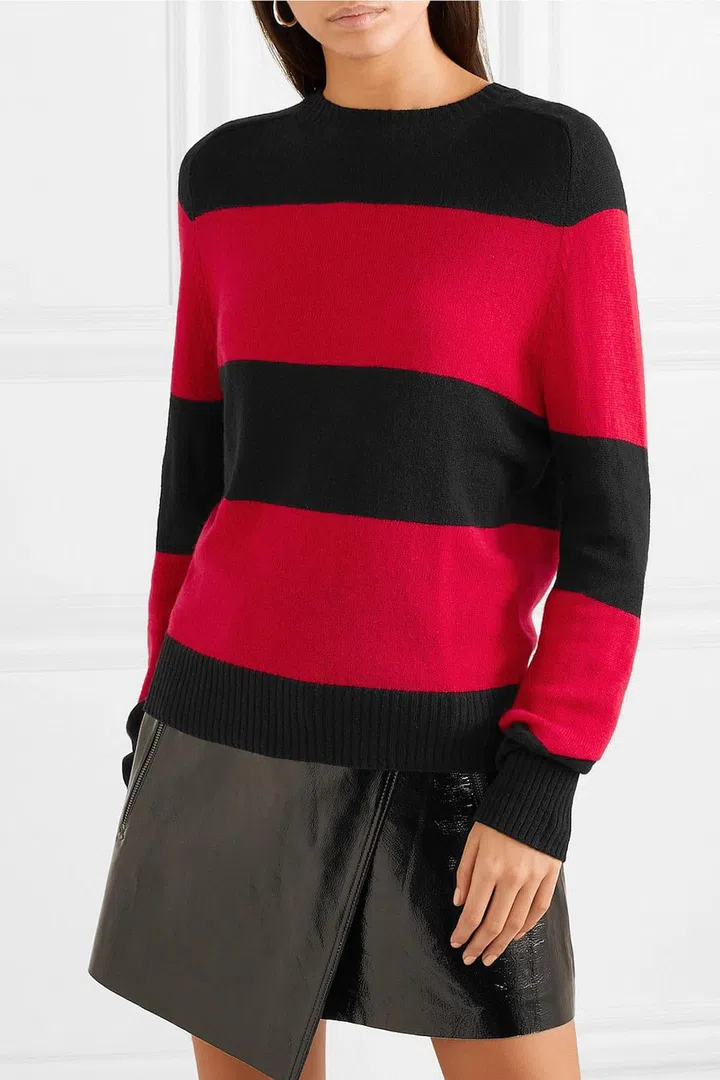 现在,综合上述的原则。以倒三角形身材来说,这件Saint Laurent毛衣就是很好的例子,肩膀的黑色块让你显得更瘦,而明亮的白线条让胸部与臀部显得比较宽,把视线从宽大的肩膀部位移开。