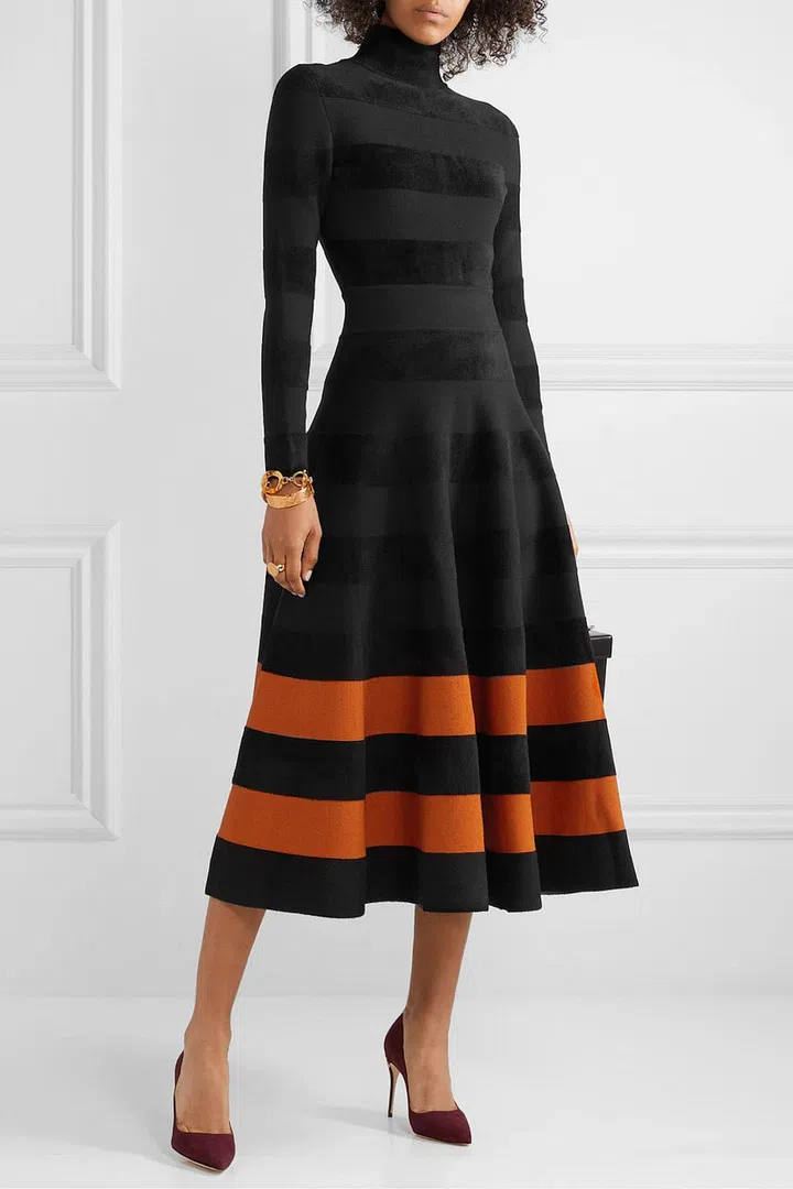 一般上,深色看起来比较隐蔽,亮色看起来比较靠近。这件Oscar de la Renta 巧妙利用黑色的瘦身效果,让腰部以上看起来更瘦,裙摆部位显得更亮丽。