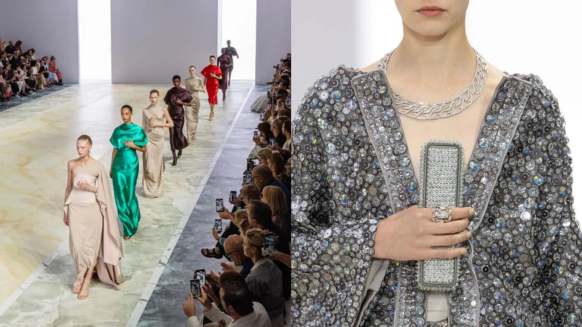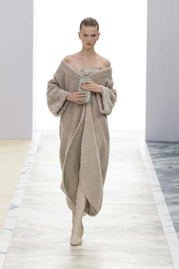 在简约大气的大理石纹舞台设计中,模特们宛如水面上的行走艺术品。轻若无物的丝绸、精致的皮草和FENDI标志性的人字纹羽饰裁剪羊毛,温暖包裹着女性身体。尽管外观简约精致,但部分礼服却蕴藏着独特细节。珠宝艺术总监Delfina Delettrez Fendi设计的珠宝盒被模特们如同戒指般抱于胸前,吸引着观众的目光。