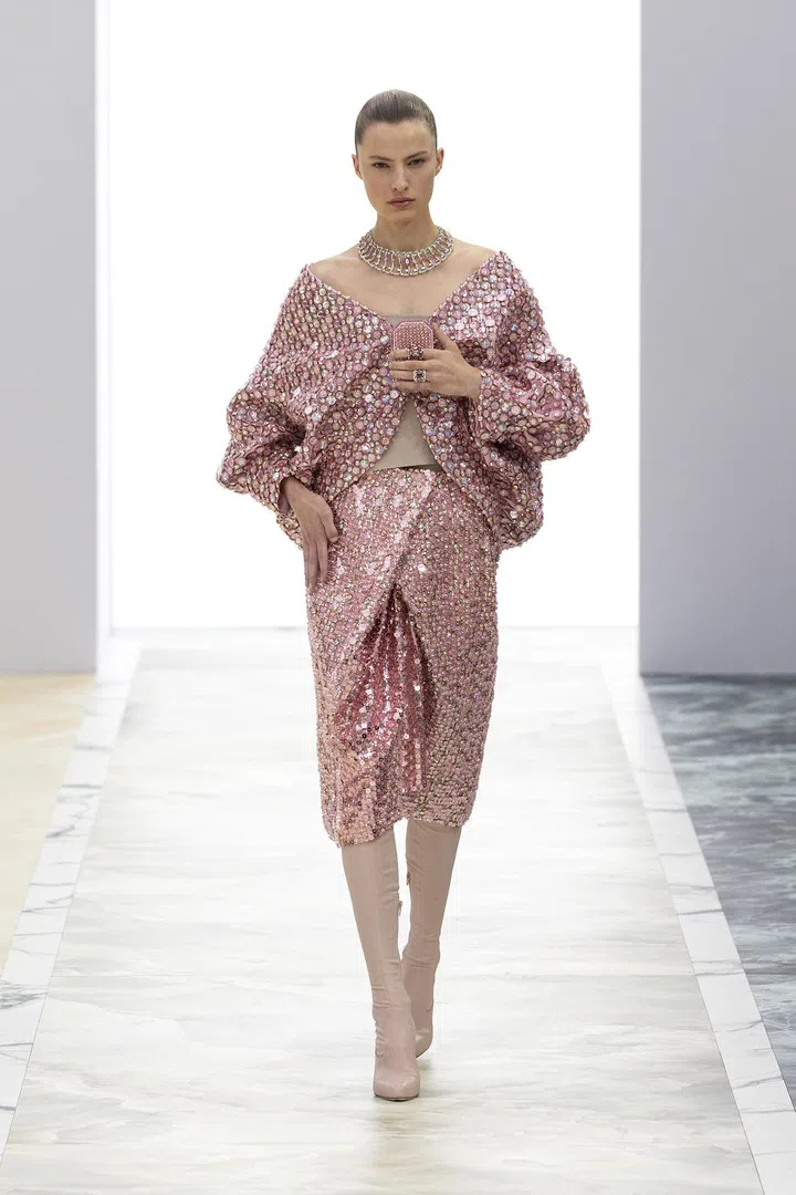 高超的刺绣工艺将服装与宝石完美结合,成为两个世界和谐共生的纽带。黄色和白色钻石,帕帕拉恰绿色、橙色和粉红色蓝宝石及尖晶石为该系列增添绚丽火彩。Kim Jones还指出,该系列的色彩灵感来源于“肌肤色调以及黑色钻石、红宝石和蓝宝石等宝石。柔软与坚硬、肌肤与宝石的碰撞绽放出精彩之火花。”Delfina Delettrez Fendi则认为,珠宝“与身体有着直接而亲密的关系”,是“女性深刻而个性化的延伸”。最后登场的造型更是吸睛,需要1200个小时的手工制作,呈现出如玫瑰金般的粉色火彩。