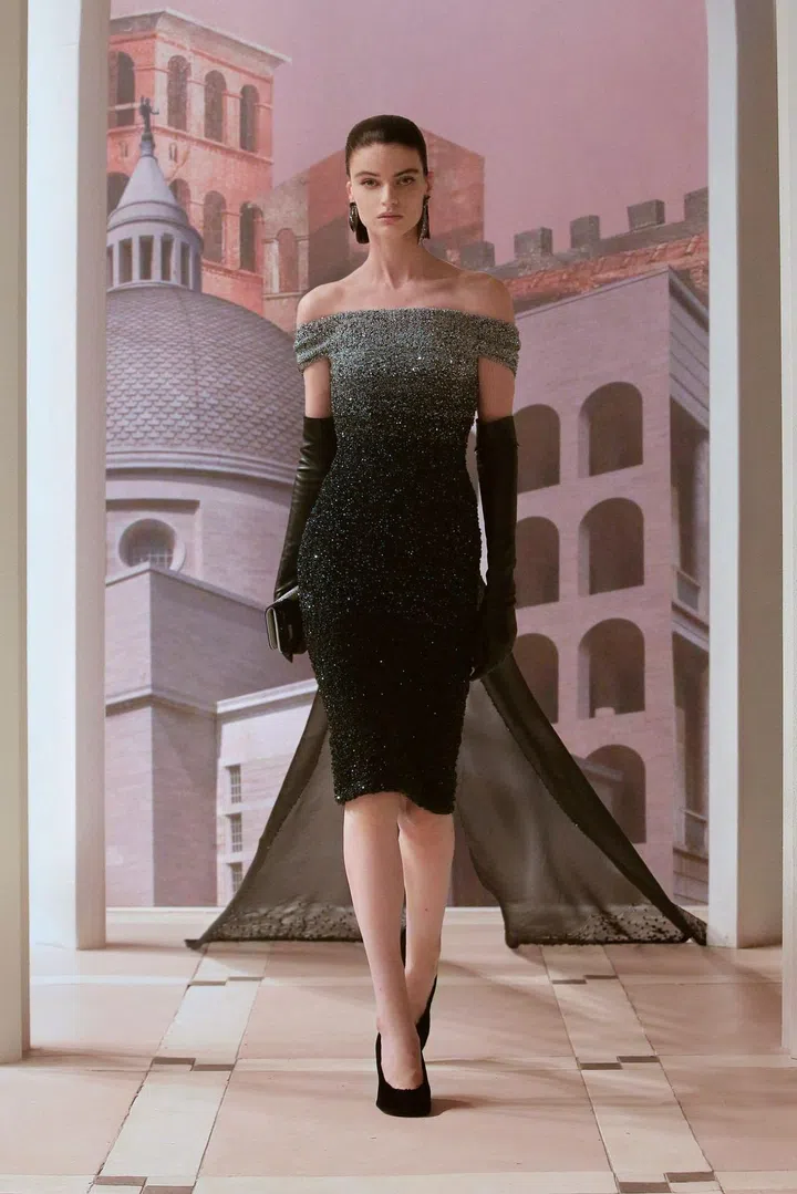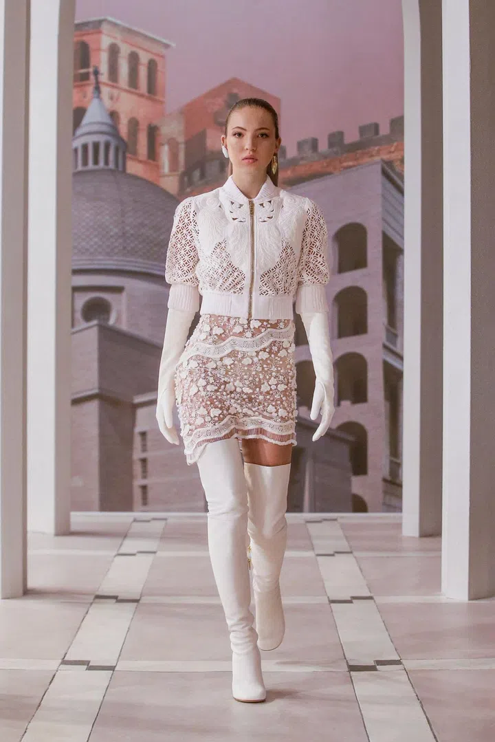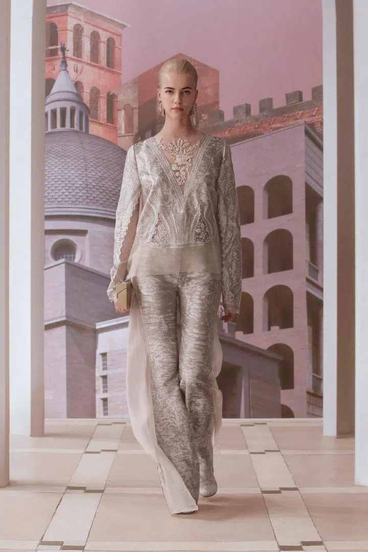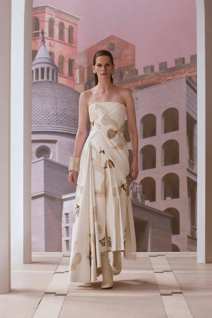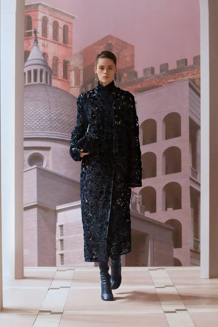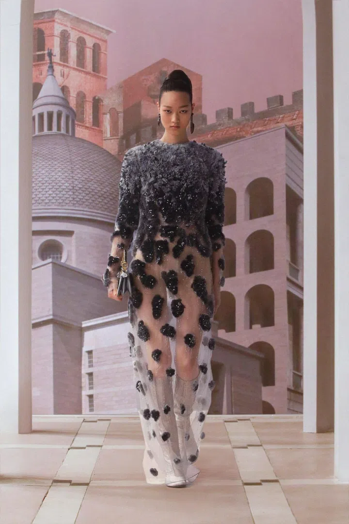 Kim Jones在新系列中融合多元灵感与浪漫构想,在罗马历史与当代语境的结合下,营造出无限幻像。他将充满力量的身形轮廓化作精巧的蕾丝衣物,皮草与织物换作缥缈的真丝提花再现,水晶细珠以Cornely缝刺技术缝制于面料上,还有作品亦复苏了Fendi Palazzo四周的罗马雕像,错视效果(trompe l’oeil)的丝绸再现了大理石雕像的衣物垂坠质感,雕像所处的拱门幻化成鞋跟,繁复刺绣再现了经典的螺旋纹饰。