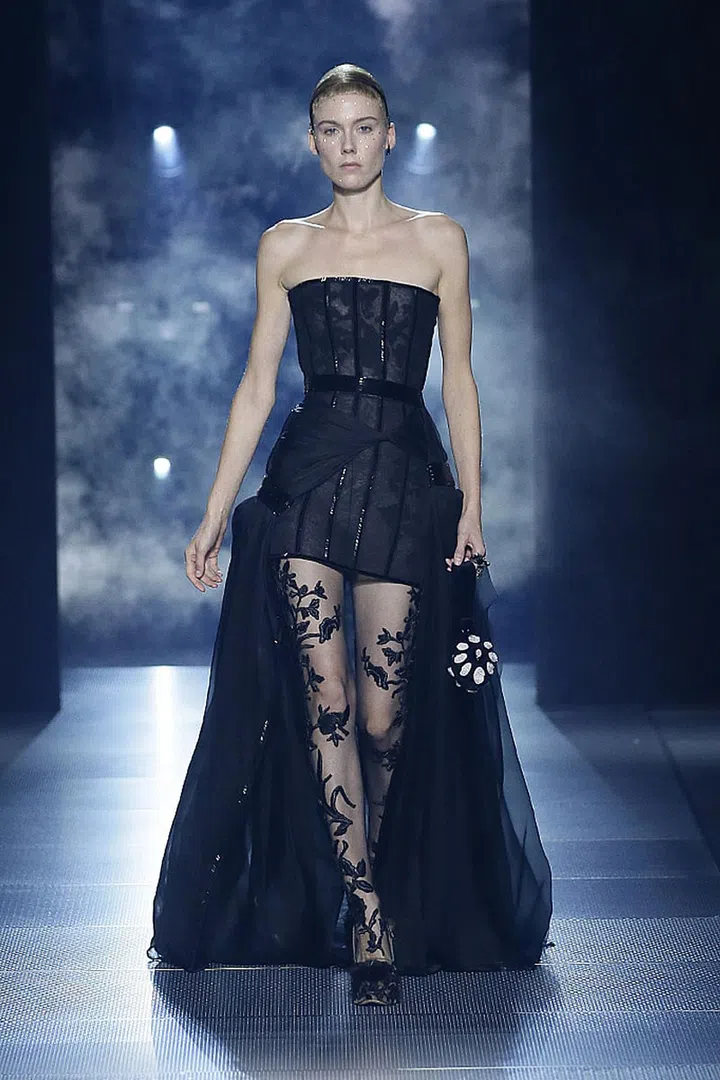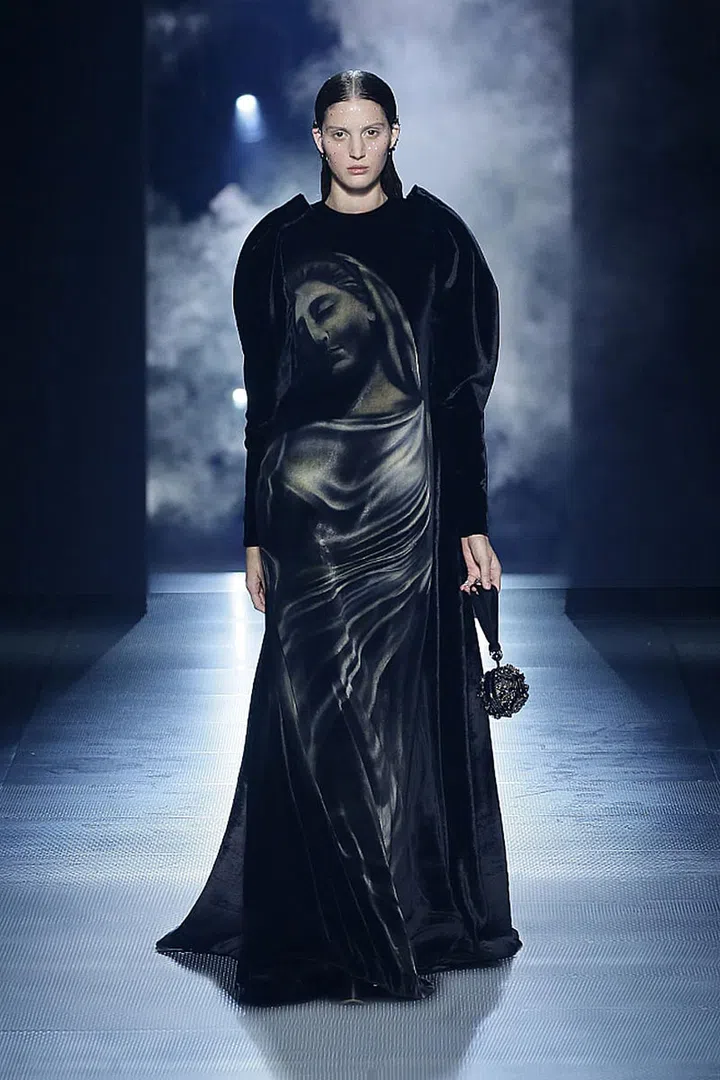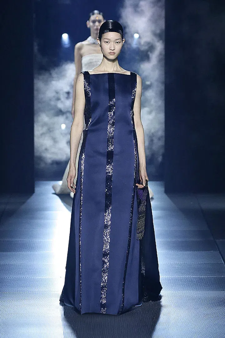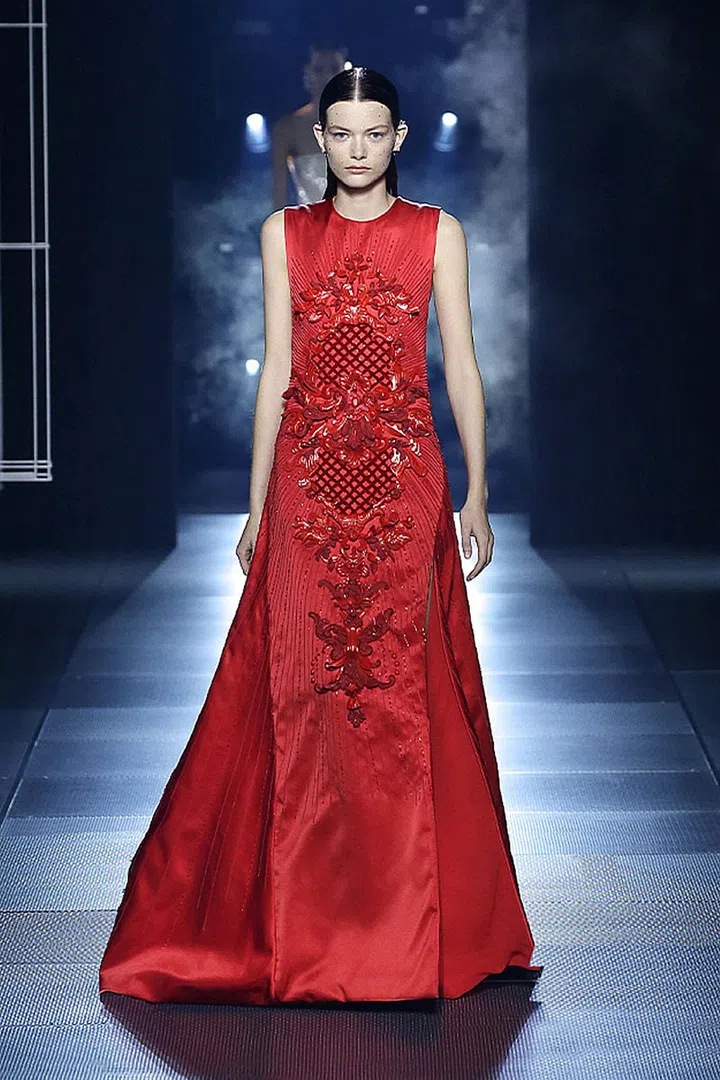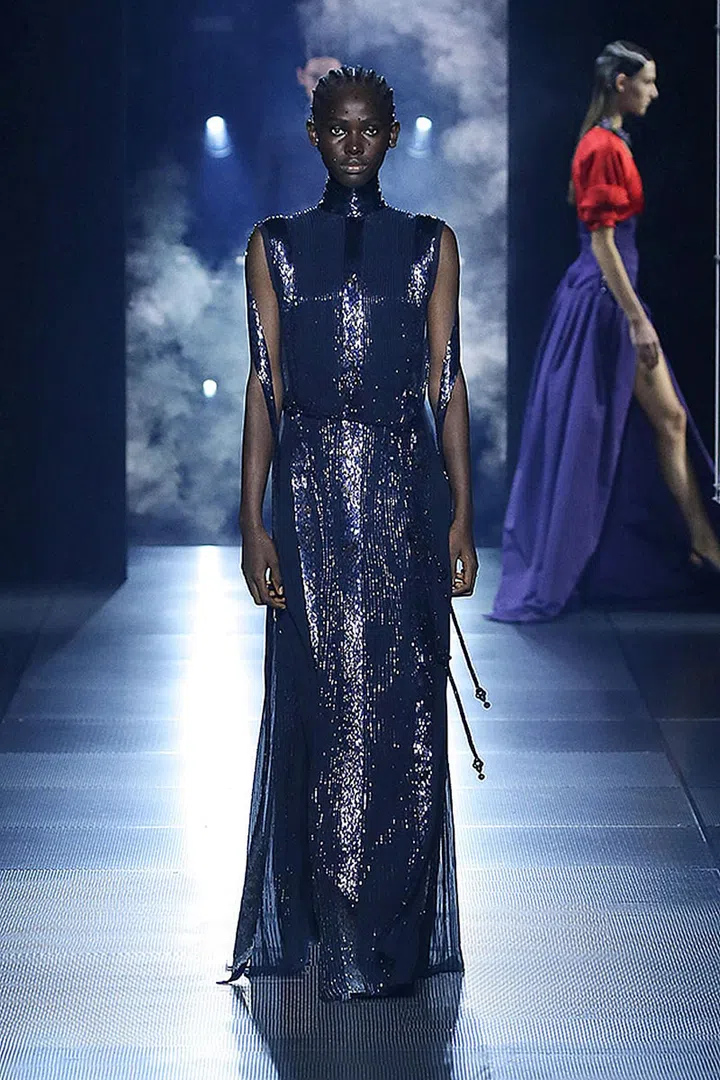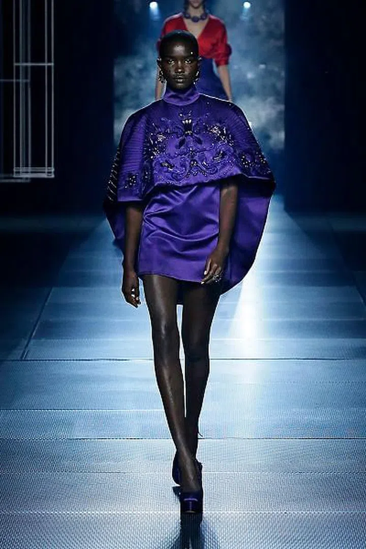 今季,我们也看到很特别的颜色搭配——黑色和深蓝色中穿插了对比鲜明的红色和紫色。在罗马神话中,红色与血和勇气有关,它是战神的颜色;而紫色与皇室、权力和财富有着紧密的关联。在色彩的基础上,设计师注入各种设计巧思,比如融入巴洛克式装饰、精巧的刺绣、印花和亮片元素,强化了极简礼服的轮廓,低调中透着奢华。