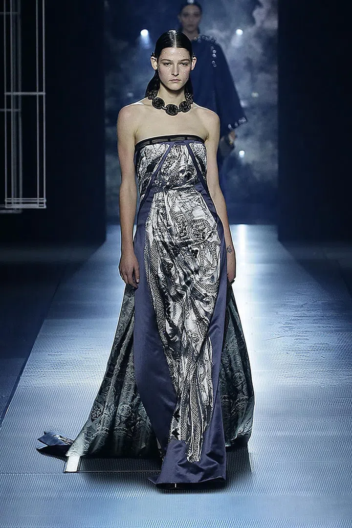 整个系列以幻梦与现实为依托,结合传统技术与现代手工艺,将这种独特的气质具象化,找出过去与现在的接合点。大秀以一系列修身剪裁的礼服开场,富有垂坠感的面料突出了礼服裙流畅的线条。