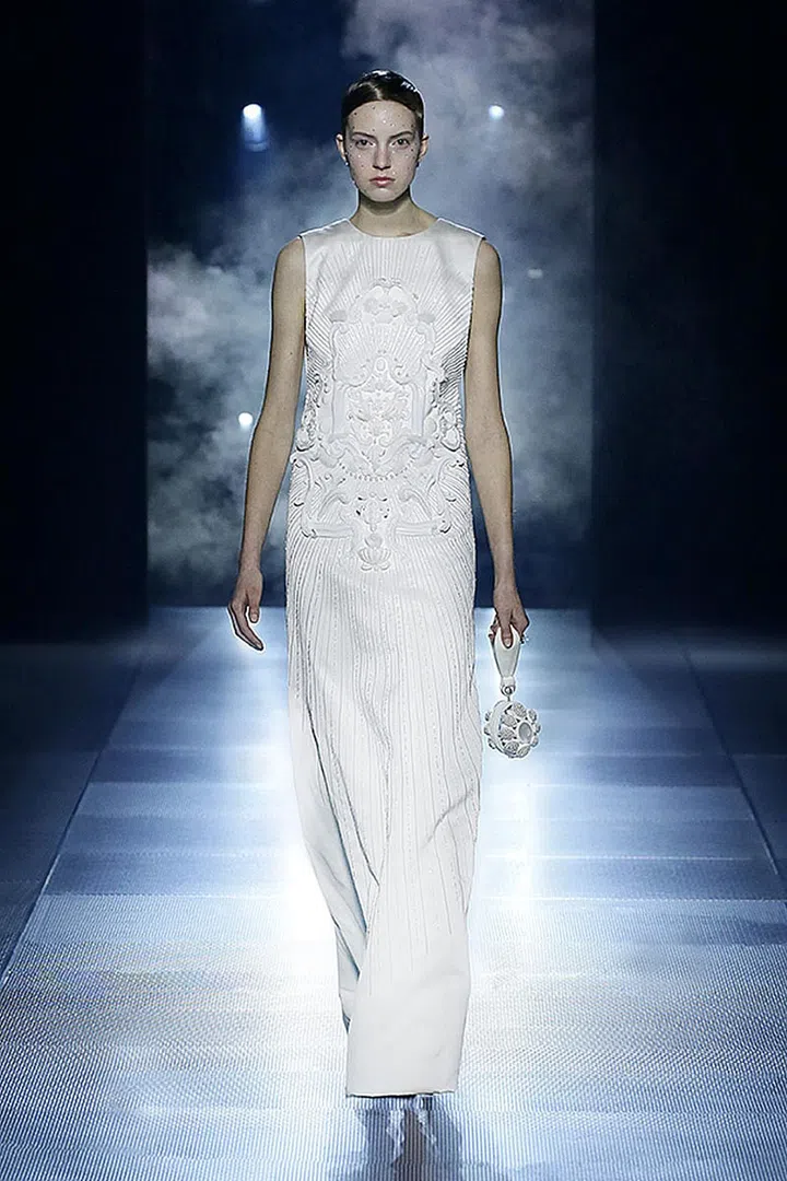 系列中的白色礼服充满雕塑感,不禁让人想起古罗马建筑的纹理,再一次展现了过去和现在的巧妙结合。Kim Jones本季将细节拿捏得宜,将每一件礼服都做到极致,他笔下的Fendi女性充满力量,透过服饰展现女人独有的气质和风韵。