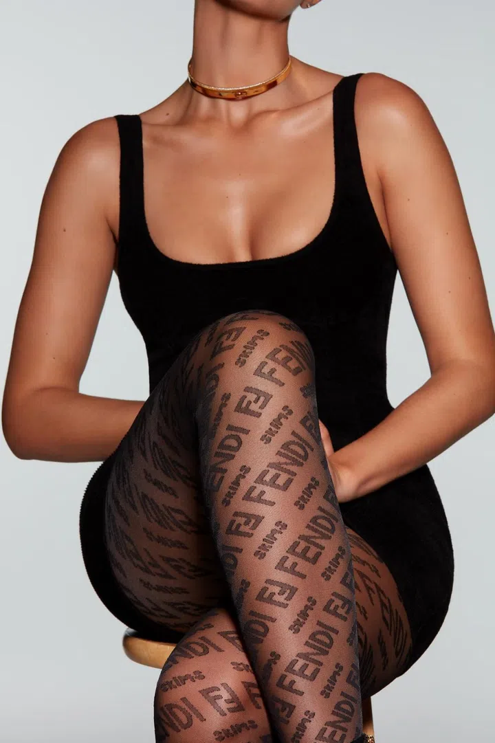 FENDI x SKIMS 联名系列借鉴了前任创意总监老佛爷Karl Lagerfeld于1979年首次展示的FENDI 系列草图,将重点放在糅合管状抹胸上衣、流行色调和紧身腰带等元素,让本次的合作完美展现两个品牌的独特美学。