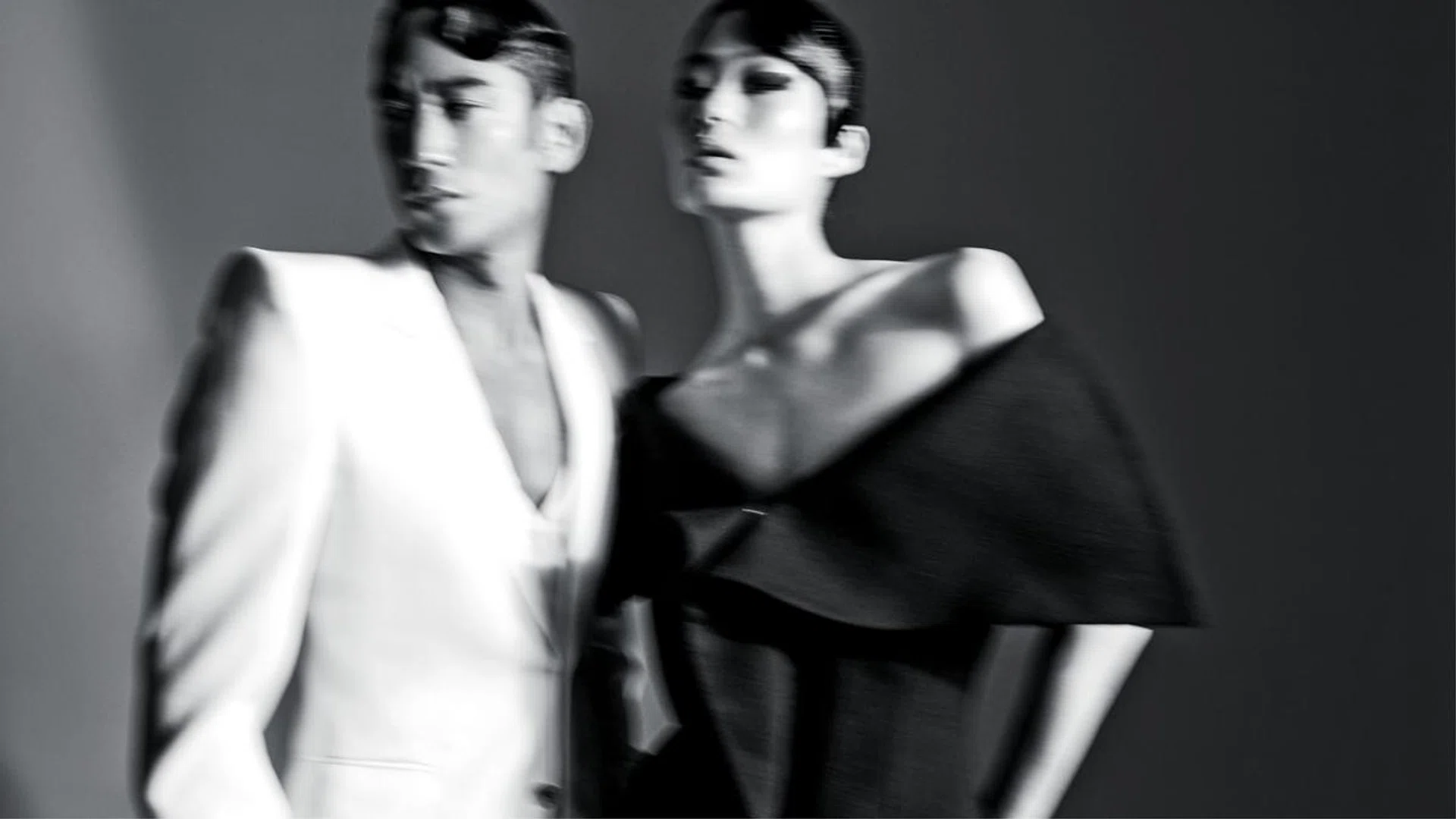 左至右: 羊毛套装/Alexander McQueen; 牛仔套装和牛仔衬衫/Loro Piana。