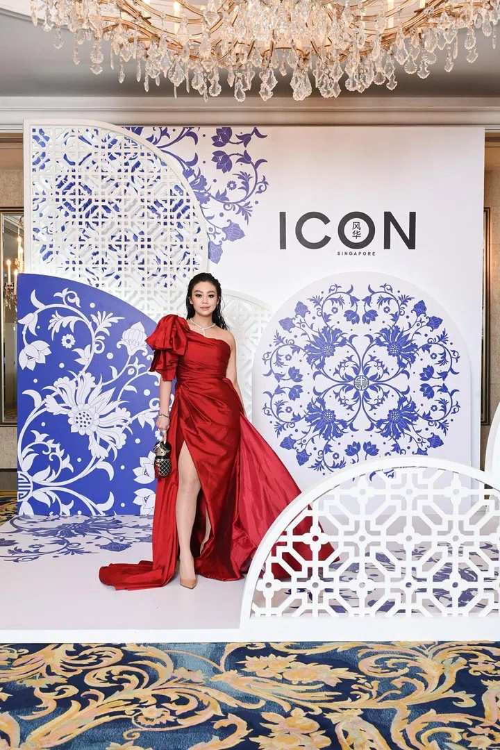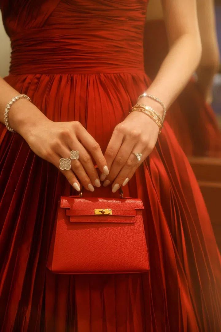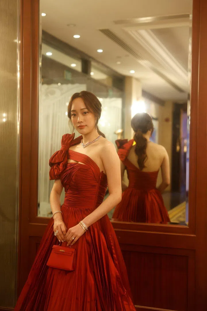 在东方文化中,红色象征着吉祥和喜庆。Zanelle Lim特别挑选了一件由Stylelease提供的Tarik Ediz晚礼服,以深红色为主色调,在光线下闪耀出液体般的流动光泽。她以同色系的爱马仕迷你Kelly手袋做搭配,衬托出温柔之美。