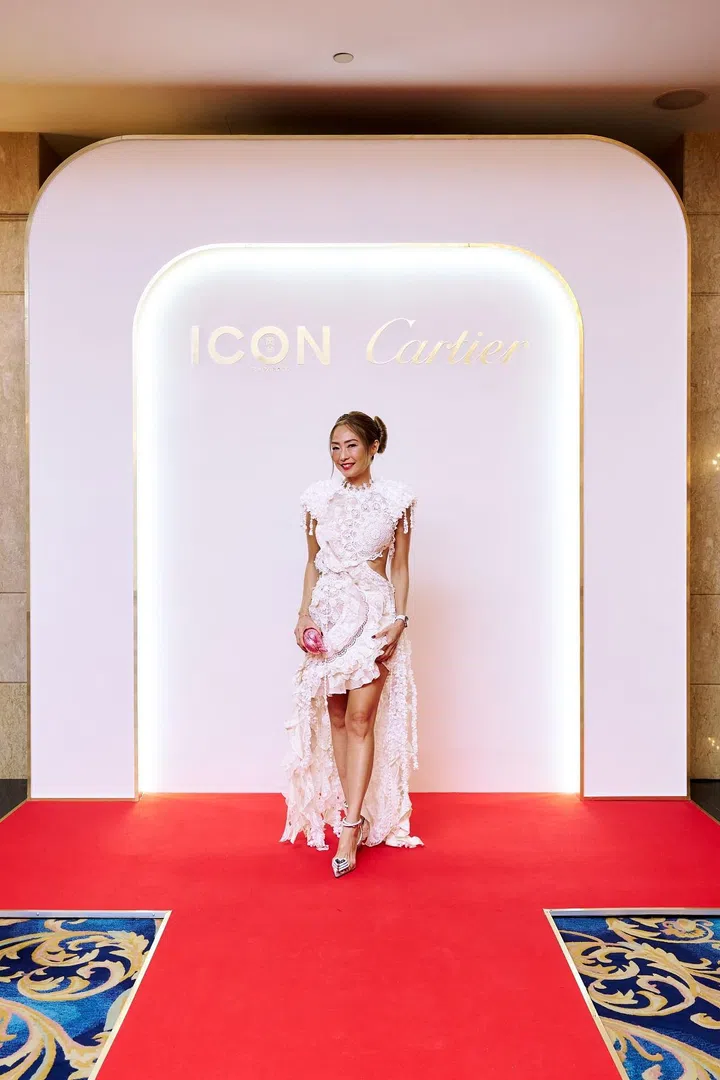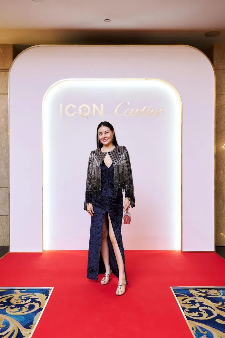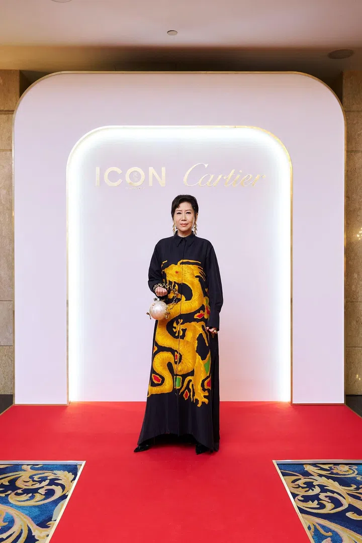 Dana Cheong反戴卡地亚(Cartier)Panthere猎豹系列高级珠宝项链,搭配同系列高级珠宝耳环和手镯,手中的迷你手袋来自Louis Vuitton,与珠宝完美搭配。