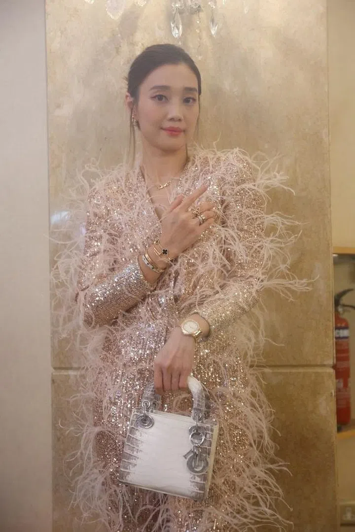 Lydea Tan以一袭Elie Saab亮片羽毛造型,搭配喜马拉雅鳄鱼皮革Lady Dior手袋,诠释优雅大方的气质美。