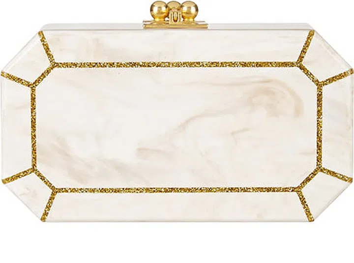 以制作首饰起家的Edie Parker推出一款华丽至极的Fiona手握包,以纯手工精制而成,是新娘婚礼晚宴包的上选。包身的大理石纹路以亚克力质料制作,流线型的简约清包身高雅大方,设计师还巧妙利用金色亮粉为包款营造网状图腾,具有画龙点睛之效,为手握包凭添一抹奢华气息。准新娘可透过Netaporter.com购得这款手握包。