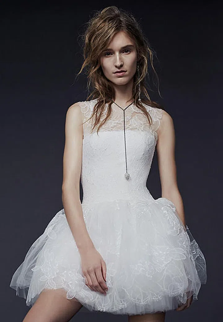 穿上曳地婚纱礼服步入礼堂,是许多准新娘的梦想。婚纱女王Vera Wang则反传统的在2015秋冬系列婚纱作品中,推出一件短版婚纱,俏丽又活泼,着是设计师对摩登婚纱的崭新演绎。她以品牌签名式的多层次薄纱为主材,纱上的花卉刺绣更展现过人的精细工艺。