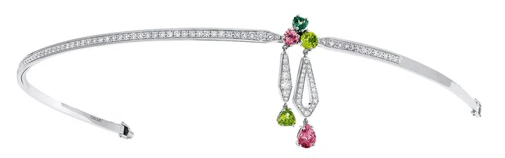 冠冕对偏爱传统婚礼的新娘子而言似乎有欠庄重,但却是梦幻绮丽婚礼的必备单品。Chaumet的Josephine珠宝系列,是品牌向法国约瑟芬王后致敬而推出的设计,其中全新的Precious Raindrop冠冕由18K 白金打造,镶嵌钻石、粉红与绿色碧玺,以及两颗橄榄石,肯定能让新娘子的造型营造奢华感。垂挂的宝石有突显前额线条的作用,更如同天降甘霖般滋润一对新人的爱情。