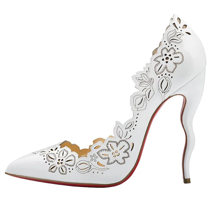对风华女子而言,红底鞋Christian Louboutin是她们终其一生想要收集的目标。大喜之日上,若有红底鞋的加持,对时尚新娘来说更具意义。品牌推出一款白色高跟鞋,聚焦斜面上的镂空花卉雕刻图案,几何剪裁的鞋扣有修饰脚板的功能,营造百花盛放的唯美感。弯曲线条设计的鞋跟更是神来之笔,为高跟鞋增添设计感。