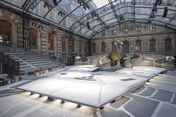 Louis Vuitton 2018 秋冬时装秀在LEFUEL庭院举行,品牌在这里建起了太空飞船,将悠久的历史建筑与前卫的室内场景相结合,宛如一场徜徉于过去与未来之间的时光漫步,模特们仿佛从过去走向了奇妙的未来。