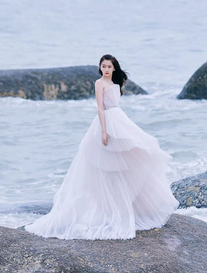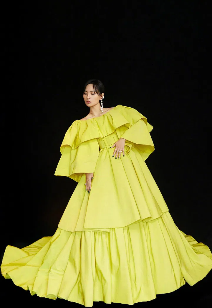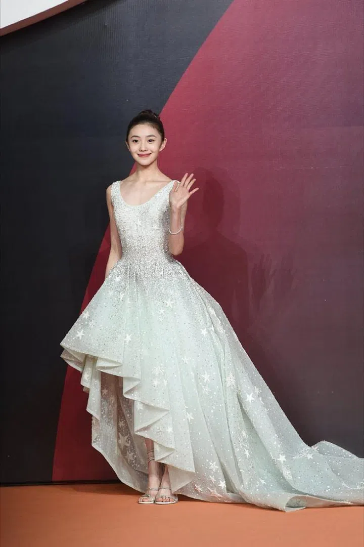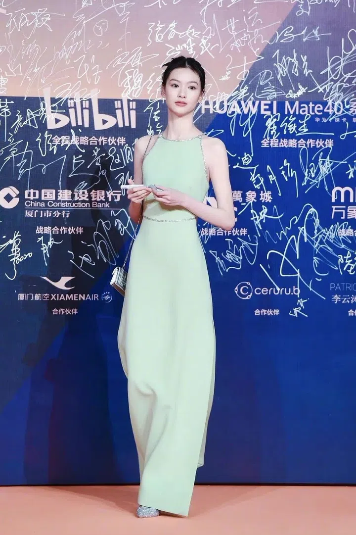 在金鸡奖闭幕式上献唱《一秒钟》同名主题曲的刘浩存,身穿Rami Kadi 2020秋冬高定水绿色星光礼服,搭配Rene Caovilla高跟鞋,优雅得体,如美丽的童话公主一般。