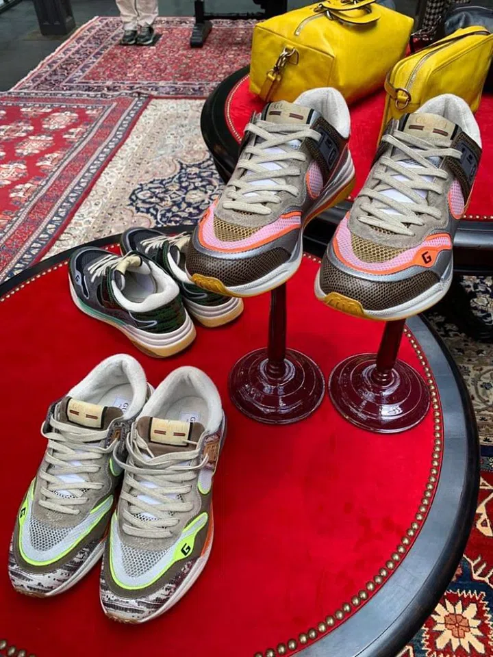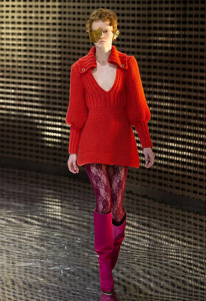 自Alessandro Michele接手后,带给Gucci焕然一新的面貌,也让“极繁主义”的设计概念在品牌故事中发酵。本季的服装似乎比起以往更中规中矩,色系方面则穿插了柔和的色调美学及鲜艳大胆的撞色拼接。创意总监标志性的结构式剪裁与图腾印花依然是亮点,像是百褶烫金材质、蕾丝、金属缇花布料和罗纹印花绸缎等的使用,配上复古轮廓贯穿整个系列。宽松垫肩西装,束口宽管库、羊腿袖、华丽宫廷领衬衫都展现Michele对复古美学的痴迷。