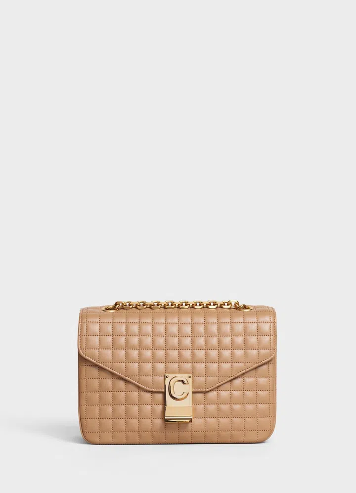 这款名为C Bag的中号绗缝小牛皮肩背包,在2019春夏巴黎时装周上引起热烈讨论。Celine C Bag包身的方格设计复刻了1980年代的Celine经典皮包,字母C金属扣灵感源自1970年代的Celine Closure,而链带则效仿围绕法国凯旋门的铁链。环环相扣的复古元素,想必是设计师Heidi Slimane借由首个系列想历史致敬。C Bag为中号尺寸,共有闪亮小牛皮、绗缝小牛皮和稀有皮革可选择,简洁大方,百搭精致。