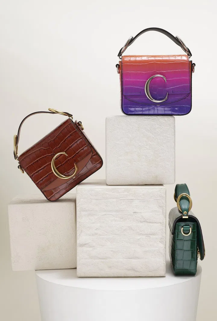 Chloe创意总监Natacha Ramsay-Levi设计的2019春夏配饰系列,借鉴了伊比沙岛与摩洛哥,结合嬉皮现代主义和新时代波西米亚风,运用流苏、印花、抽绳等元素,展现Chloé女孩自然、性感等多面貌。这款新Chloe C 包,以亮泽的仿鳄鱼纹皮革制成,包身的抛光金色“C”字装饰则直击本季标志logo的潮流靶心。