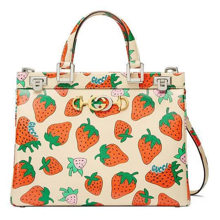 Gucci Zumi手袋是本季的最新创作,亦为品牌重点包袋之一。其特点在于结合两个别具历史意义的品牌标志:互扣式双G及Horsebit金属缀饰,取自Gucci档案并以金色和银色混搭而成。Gucci Zumi手袋系列分为单手柄和单肩背等款式,材质方面除了有光/粗面皮革,也有珍稀皮革,如蛇皮(黑色,大地色和红色)、鳄鱼皮(棕色,深绿色和灰色)、鸵鸟皮(浅棕色,焦橙色和象牙色)可选择。另外,中号Gucci Zumi单手柄与迷你单肩版本更以于服装系列可见的草莓印花图,最为吸引瞩目。