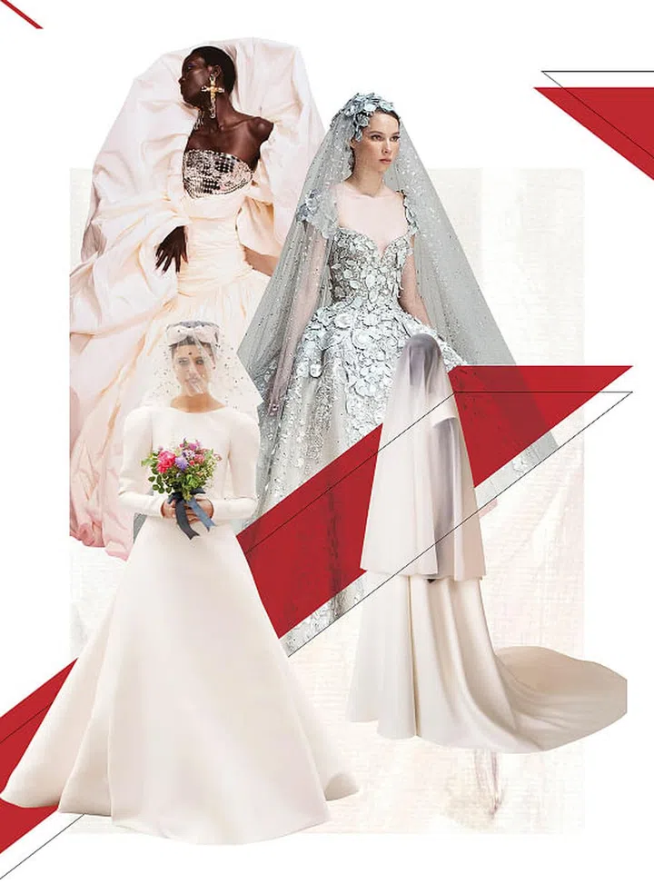 疫情当前,却没有局限设计师天马行空的创意,各大品牌2021秋冬系列中的婚纱礼服就是最好的证明。Schiaparelli 的压轴造型,是一件象牙色的塔夫绸平口礼服,镶上水钻的银色胸衣,搭配手工褶皱营造出的饱满裙摆和宽袖,相当惊艳。Elie Saab 依旧使用独具品牌特色的方式书写女性故事,本季运用大量的花卉元素,象征美好与希望.最后登场的婚纱礼服点缀着繁复精美的刺绣细节,展现高定的非凡工艺。