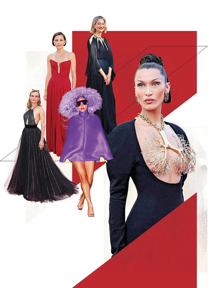 名模Bella Hadid所穿的Schiaparelli高定服装以黑色裙身配人体肺部为灵感的金属项链,一登场便抢尽风头,占据各大社交平台。意大利演员Alba Rohrwacher则身着Dior2021秋冬高级定制百褶礼服,颈肩设计别致,让人眼前一亮。