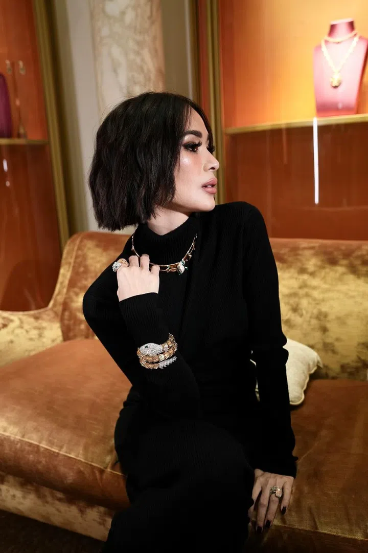 Heart Evangelista 身穿Loro Piana黑色高领羊绒连衣裙,佩戴宝格丽(Bulgari)高级珠宝。