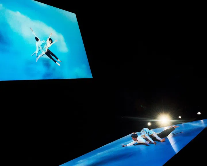 在摄影棚般巨大的开阔空间中,七个场景依次展开,诉说神话中双翼飞马帕伽索斯和七匹小马驹的故事。舞者、编舞家、灯光师和影像技师默契配合,联袂呈现一场视听盛宴:微型马戏团洋溢盎然活力;Kelly手袋合唱团演绎诙谐歌剧;交叠手套随抒情旋律踏上迁徙之旅;微风拂过,翩翩起舞的缠绵爱侣随风融入湛蓝天际……一系列生动场景皆被Jaco Van Dormael的镜头实时捕捉,并投影于现场巨型银幕,重现电影的幻象魅力。
