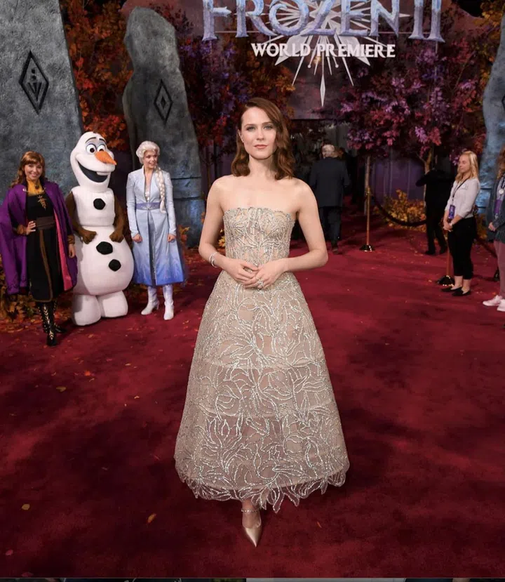 好莱坞女星Evan Rachel Wood穿着Oscar de la Renta的2020春夏系列的水晶刺绣礼服,清新的香槟色调,立体的剪裁轮廓也起着修饰身型的作用,隐隐约约的透视感,在仙气中添加一丝性感。(照片/@oscardelarenta)