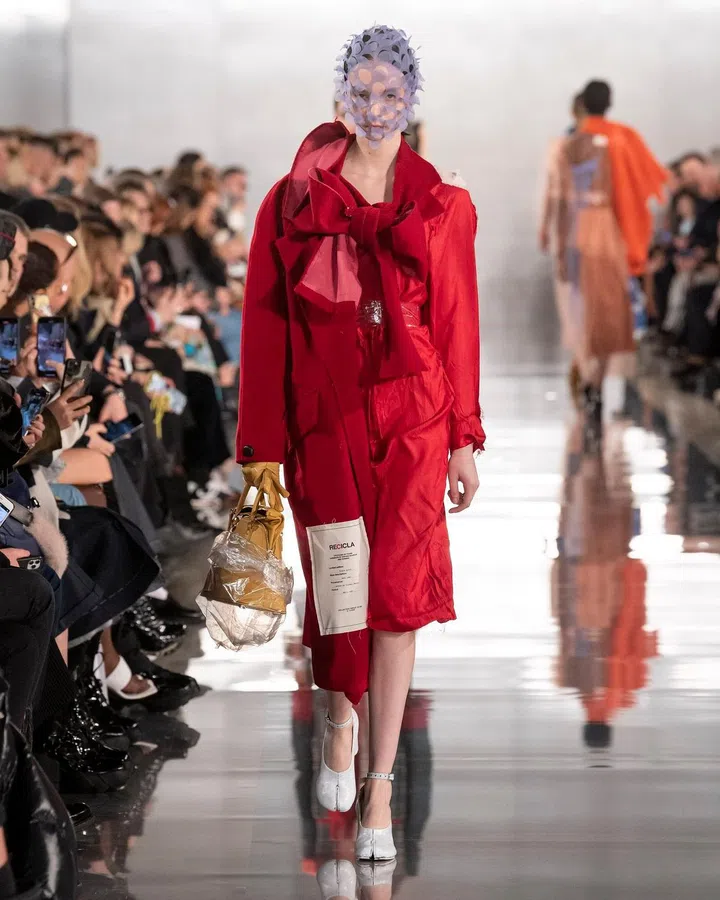今年秋冬系列,创意总监John Galliano延续品牌重制旧衣的精神,也响应可持续性时尚风潮, 推出全新Recicla系列。由他本人亲自挑选品牌旧衣,经解构重塑,打造出秋冬前卫潮服,再钉上“Recicla”白色新标签,列明服装出处、年代及制作资料,推出珍贵限量款。除了服饰,配件也融入旧物再利用的概念,他与团队回收奢侈品牌工厂剩余的皮革,再造新一代的5AC 手袋,以及使用环保素材制作的Recicla 藤织手袋、芋头叶所制 Snatched 手提包。