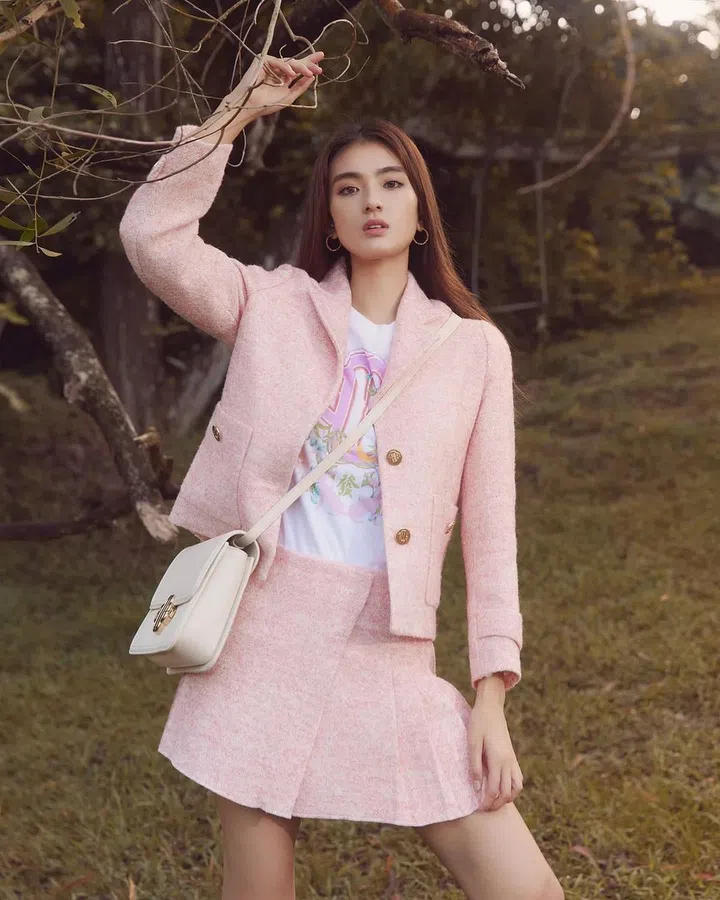一袭粉色斜纹软呢套装是时髦女孩衣橱里的必备衣装,不仅能衬托出优雅气质,更可瞬间减龄!这套造型出自轻奢品牌Maje,配上品牌的白色皮革包,挥洒青春活力。