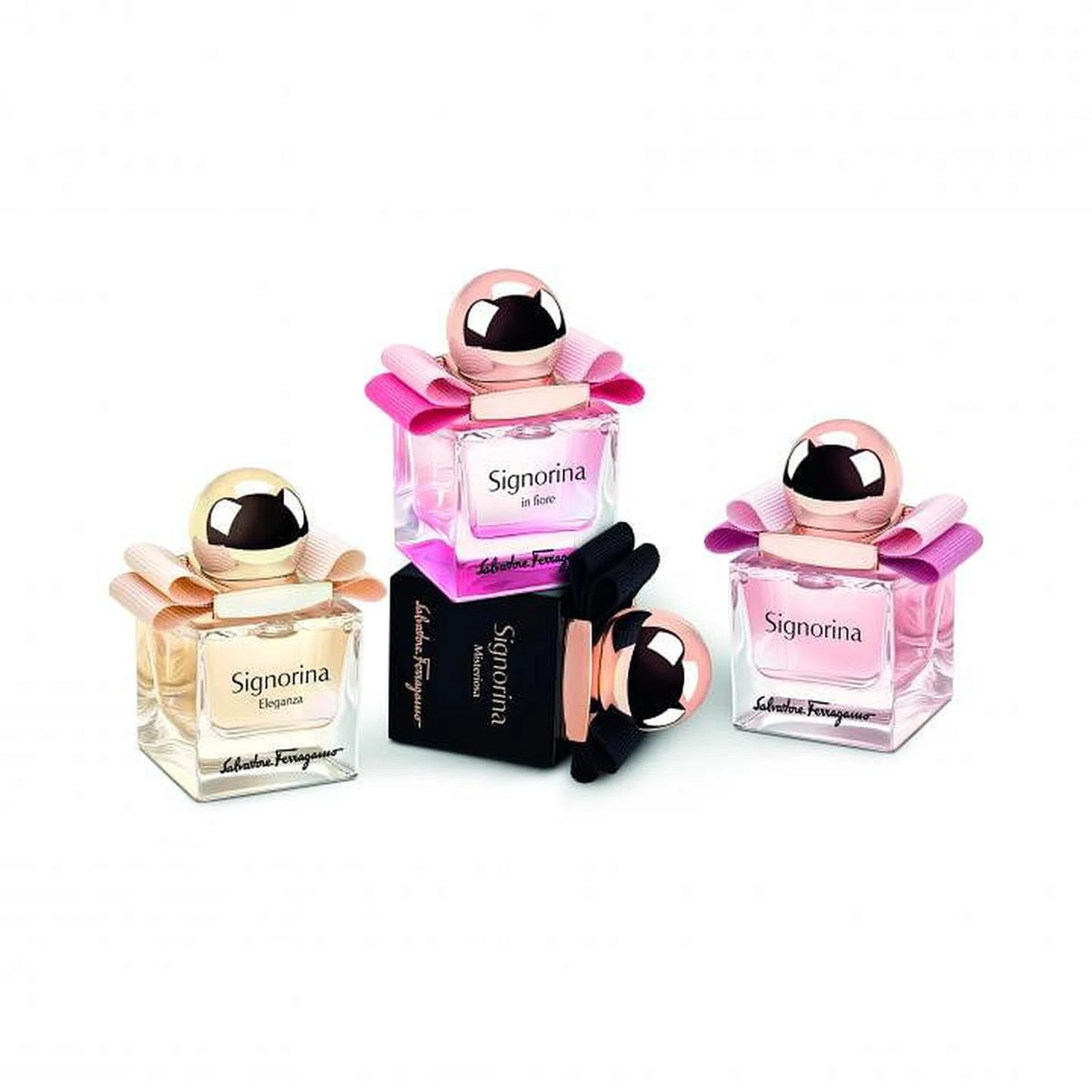 以迷你装推出的四款Signorina香氛性格各异,Signorina EDP浪漫妩媚,Signorina Eleganza高贵典雅,Signorina Misteriosa神秘性感,Signorina in fiore活泼俏皮,香水瓶由品牌经典的Vera Bow蝴蝶结缀饰。“就像每个女人会展现不同面貌一样,时而神秘,时而可爱,时而优雅。”