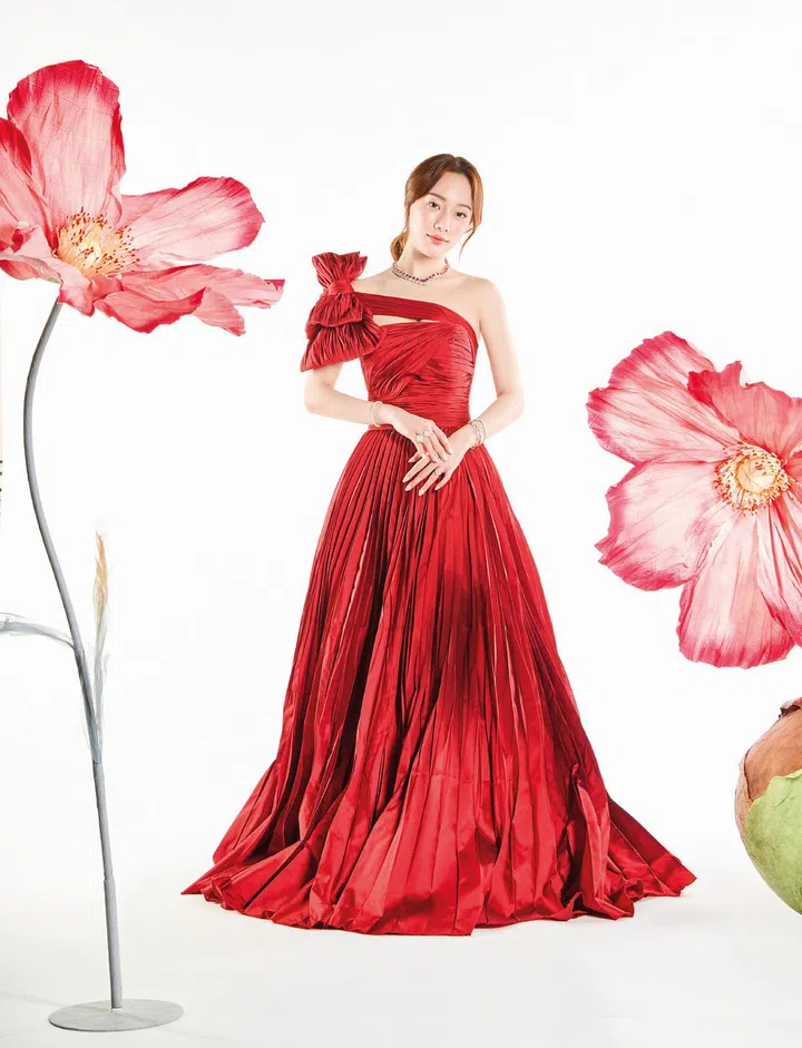 在东方文化中,红色是吉祥和喜庆的象征。林璟彤为展现这种美好寓意,特别选了Stylelease提供的Tarik Ediz晚礼服。 这件礼服以深红色为主色调,闪耀着流动液体般的光泽,吸睛十足。裙身剪裁简洁柔美,采用光面百褶裙摆, 上身细致点缀着蝴蝶元素,不仅平添高贵气质,更放大女性的阴柔之美。