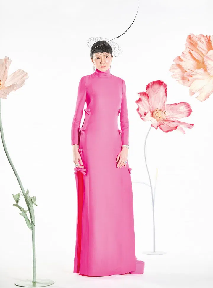 李小娟医生身穿Valentino 2022秋冬Pink PP系列礼服,搭配品牌同色系的厚底高跟鞋及Philip Tracy帽饰,强烈的风格让人印象深刻, 突显其优美动人的身姿。礼服的前襟和后襟采用优雅精美的蝴蝶结装饰,让人联想到传统服装中的盘口, 结合摩登利落的轮廓,体现出新中式之美,独具魅力。