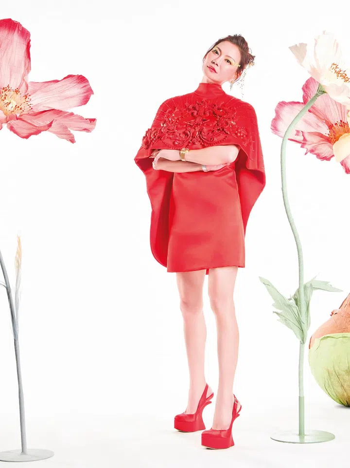 高级定制代表着时装的最高境界。卓夕琇这一身Fendi Couture高级定制鲜红色短款洋装和配戴的Fendi Flavus高级珠宝系列鸡尾酒戒指,是她给自己的50岁生日礼物。服装采用披风式剪裁,让造型更加层次分明,繁复细致的刺绣点缀,既不喧宾夺主,又能注入奢华气息。她的新中式妆容和发型充满东方气息,展现出新时代的美感,煞是迷人。