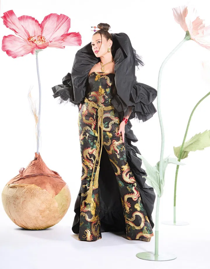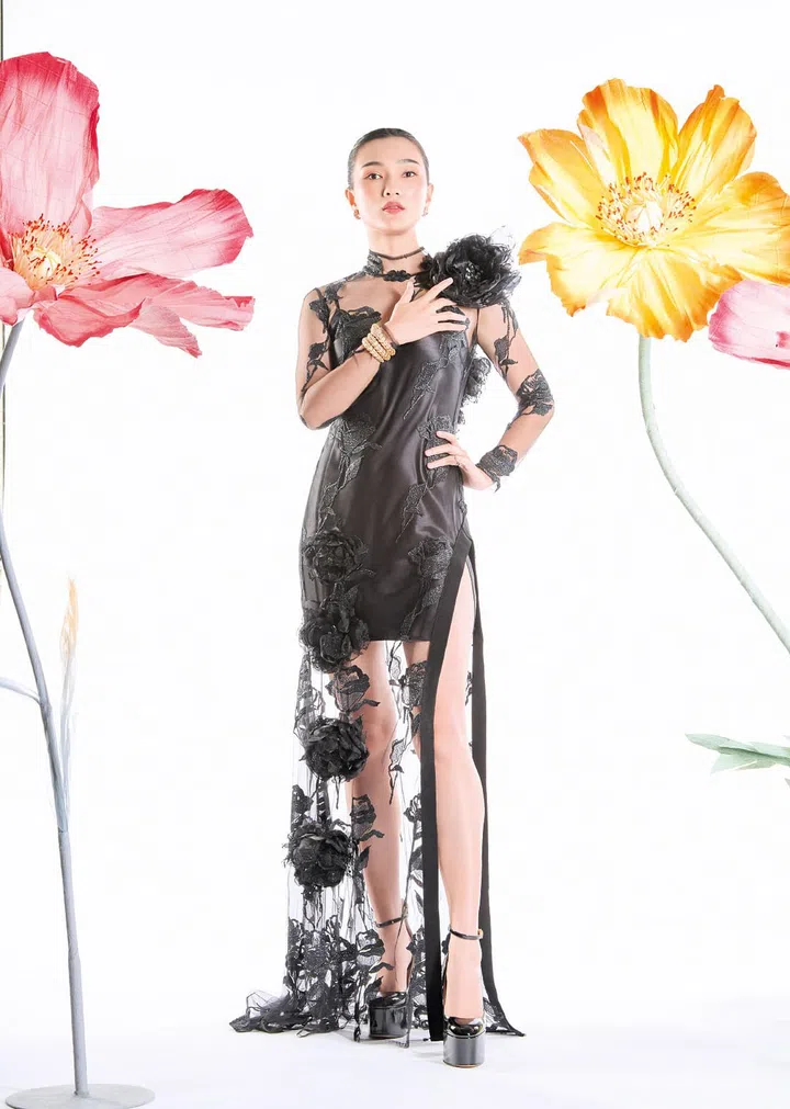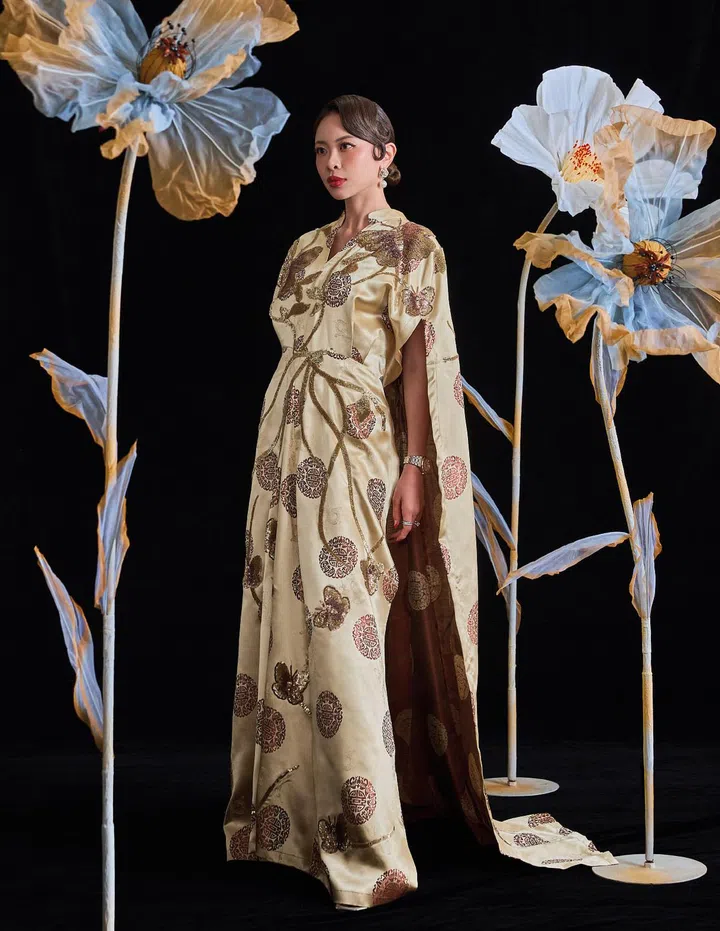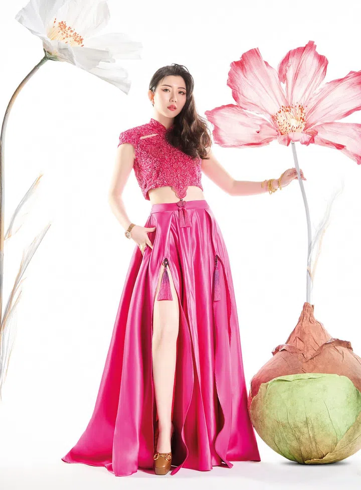 为了打破传统服装所带来的老套、俗气的印象,陈明园请来本地设计师Frederick Lee为她定制一款独具创意的新中式造型。这件服装采用雕塑形网状轮廓,饰有工艺复杂的刺绣和盘口细节,再搭上配套黑色及膝靴,独特新颖的穿搭不仅保留了东方美学,更兼具现代时尚感,华丽中显露品味与个性。