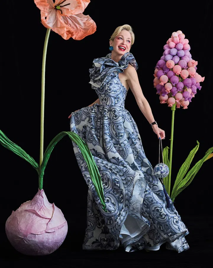 今年《风华》晚宴的主题是向亚洲过去和现在的辉煌致敬。对于主题的解析,Paige Parker选择亚洲古董中最具收藏价值的艺术品之一 ——明瓷。为营造出充满东方韵味的氛围,她选择Naeem Khan的陶瓷印花礼服,该礼服配有华丽的荷叶边领口,极具典雅之感。 此外,她还搭配同主题的Judith Leiber圆形晚宴包,呼应整个造型的和谐风韵。