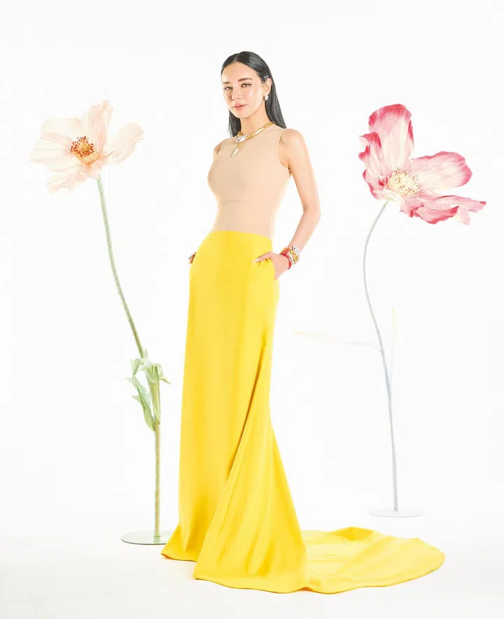简单就是美。特地从伦敦返回狮城出席《风华》晚宴的林慧俐,以一袭简洁大方的Valentino 2023春夏系列晚礼服,佩戴宝格丽(Bulgari) 高级珠宝亮相。上身采用裸色紧身设计,配上鲜艳的黄色裙摆,线条流畅,展现出女性优美的身材曲线。黄色在中国传统色彩文化 中象征崇高,具有高贵、吉祥的文化内涵,为整体造型增添一分贵气。