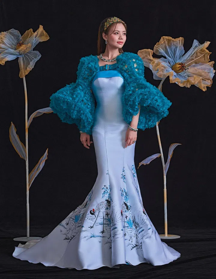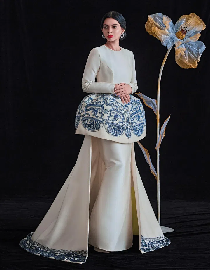 陶瓷是东方美学中的经典元素,Shabnam Arashan身着Tiiya 2021春夏高级定制系列礼服,该系列以中国陶器为灵感。这件典雅大方的缎面礼服,透过立体感的裙摆和拖尾设计,搭配蓝白相间的精美刺绣点缀,呈现出华丽而不浮夸的风格,将摩登东方美学演绎得出神入化。