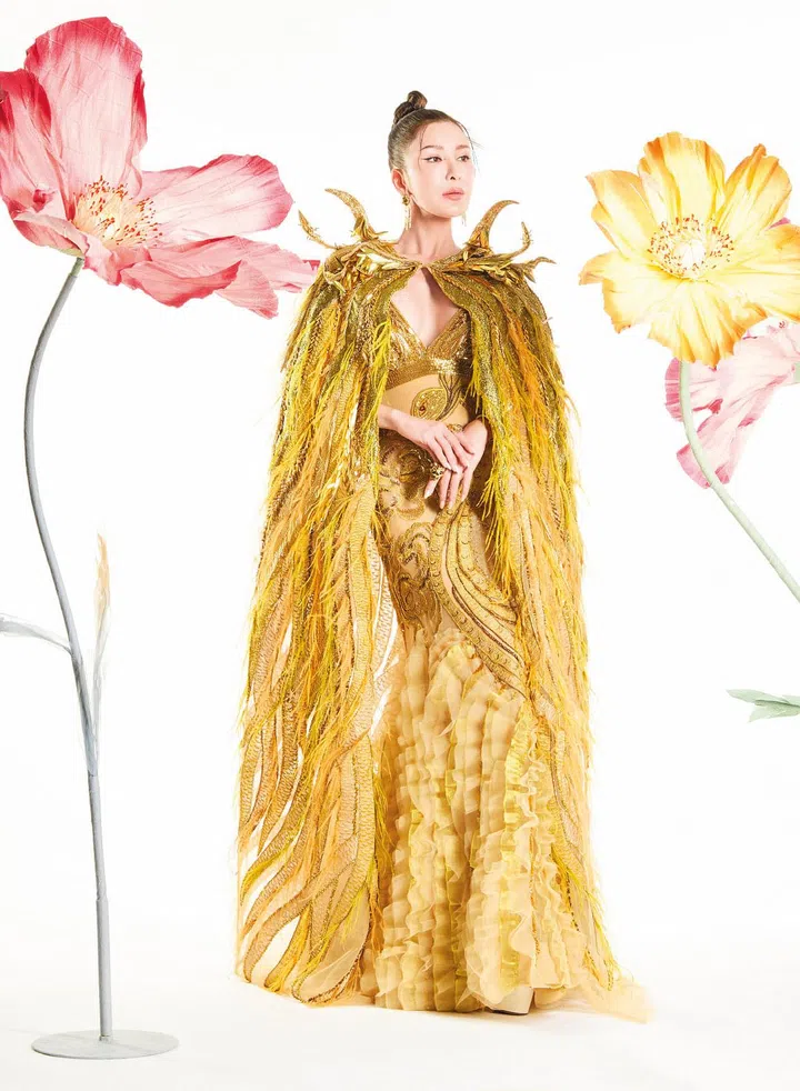 蔡欣颖身着Farah Angsana Couture量身定制的金色晚礼服,一出场就是焦点。礼服和披风的灵感来自标志性的Bob Mackie 太阳女神芭比娃娃,缀以精妙华美的凤凰图腾细节,外搭饰有羽毛细节的金色披风,犹如战场上的女王。 这套礼服由16位巴黎高定工艺师历时10天精心打造而成。