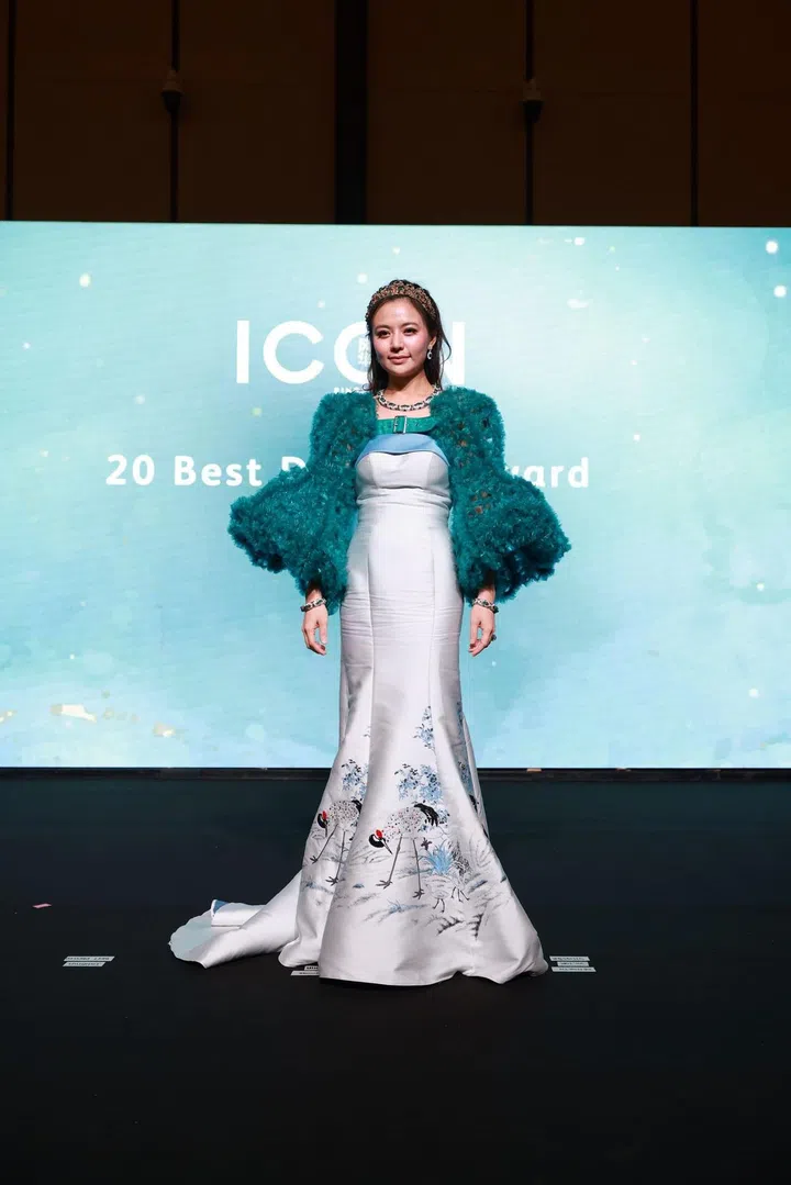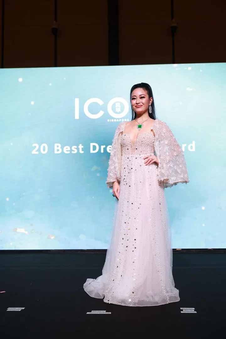 Nina Ng身着Julie Vino白色晚礼服,该品牌以高品质的时尚前卫设计而闻名。礼服缀满珍珠和亮片,在灯光下闪烁夺目,令人眼前一亮。此外,飘逸的精致长袖设计上布满了细腻的刺绣,完美诠释了其迷人的魅力。她还佩戴来自Larry Jewelry的翡翠项链,充满东方风情的神秘韵味。