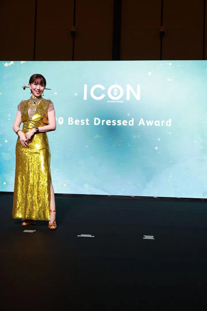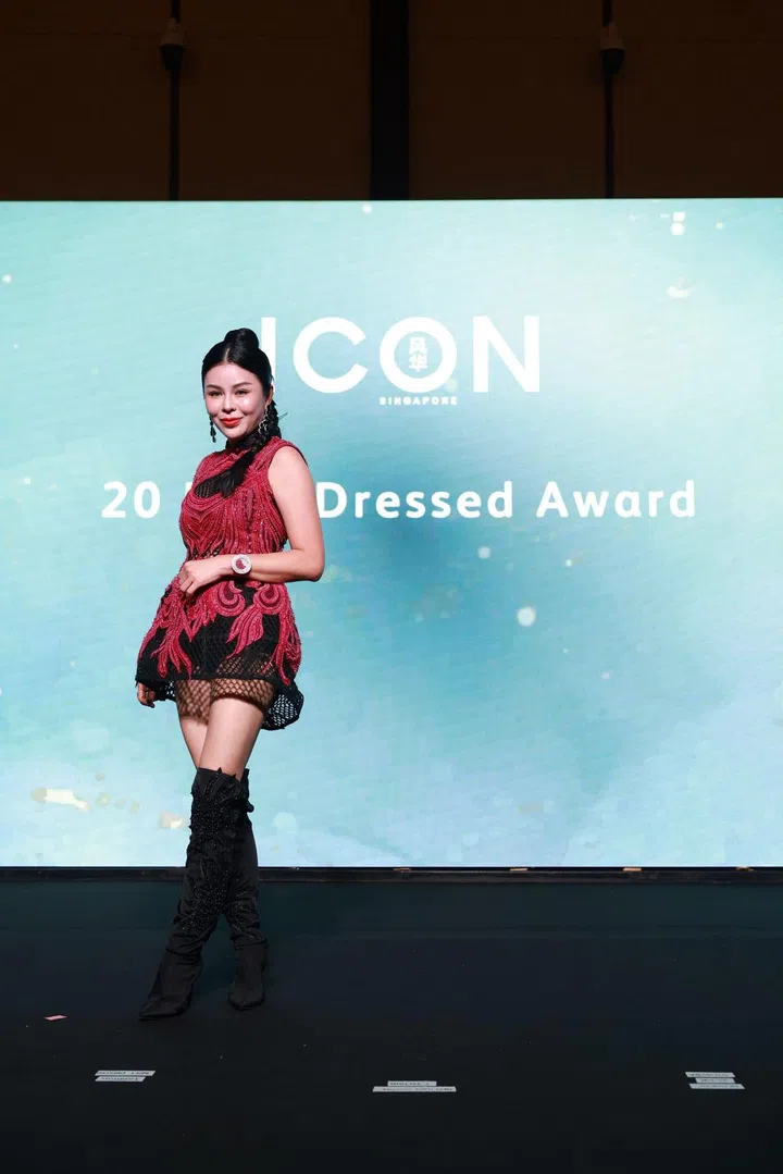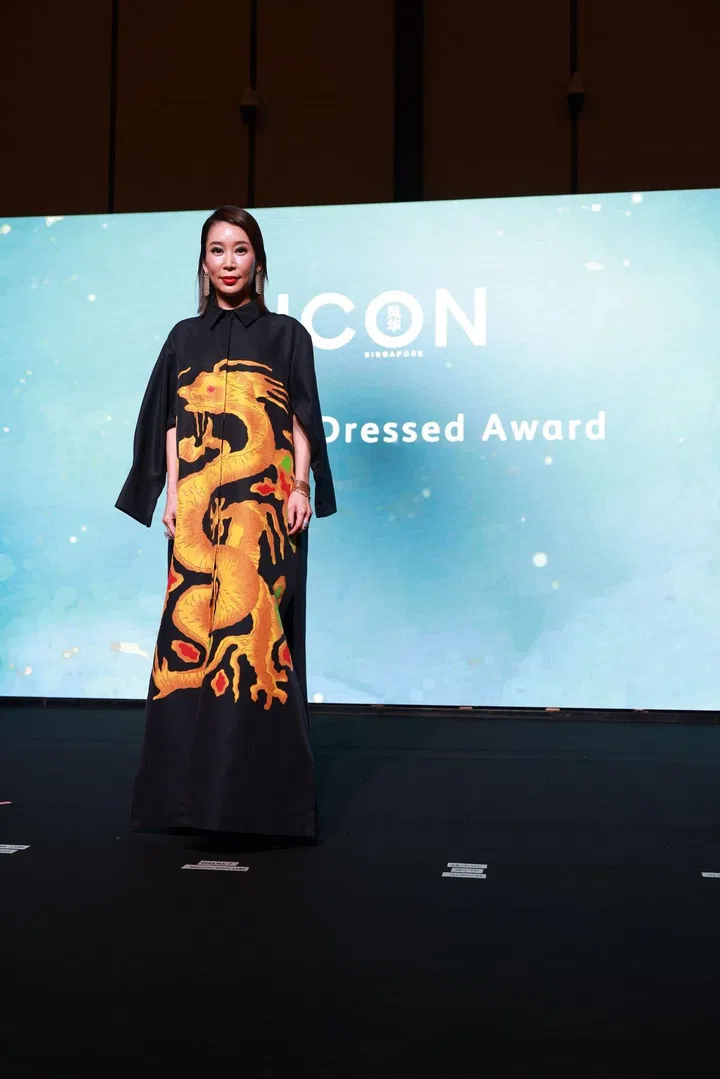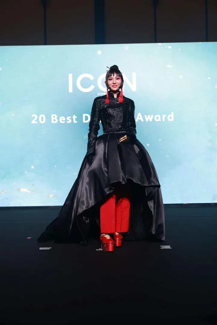 为了打破传统服装所带来的老套、俗气的印象,Sharel Ho邀请本地设计师Frederick Lee打造了一款独具创意的新中式造型。这件服装采用雕塑形网状轮廓,饰有工艺复杂的刺绣和盘口细节,在搭上配套黑色及膝靴,独特新颖的造型不仅保留了东方美学,还兼具现代时尚感,华丽中显露品味与个性。