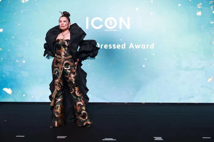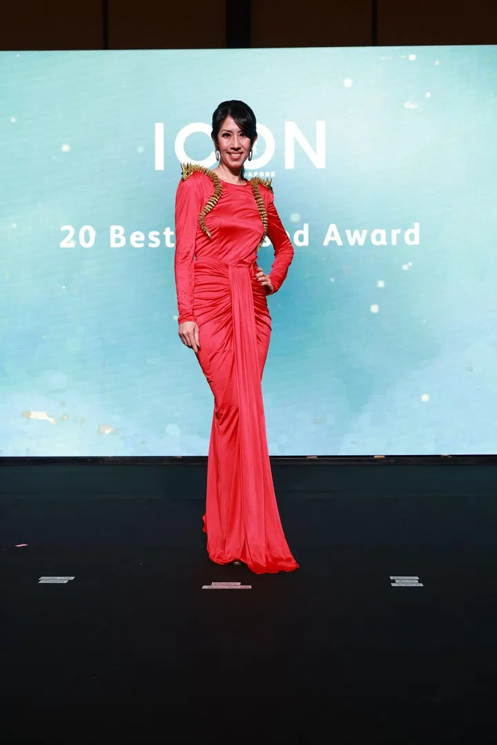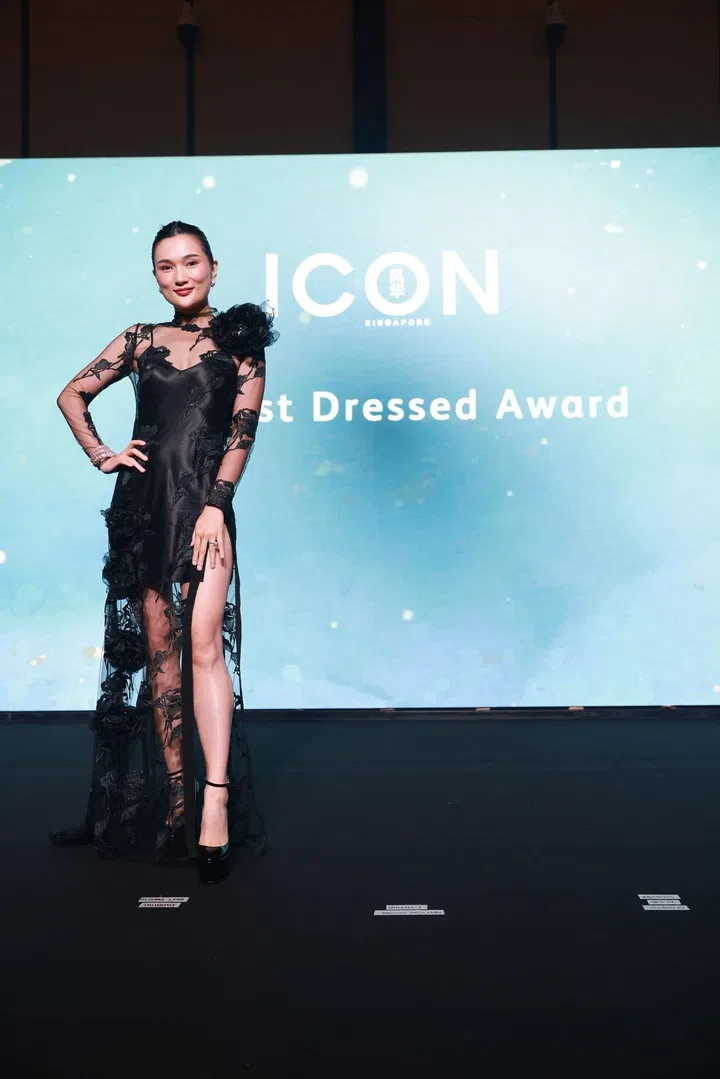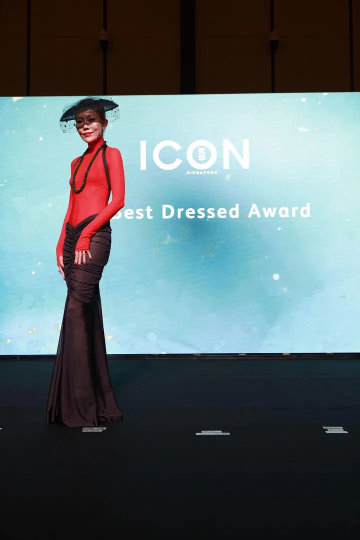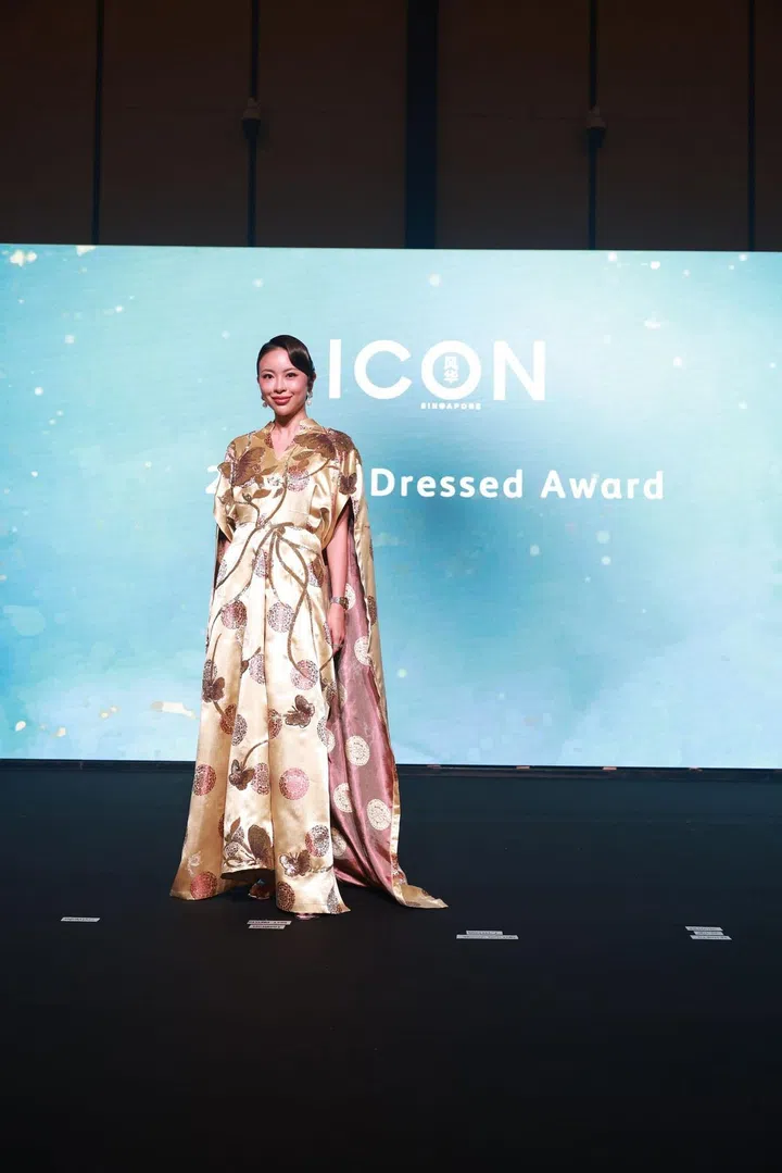 为了打破传统服装所带来的老套、俗气的印象,Sharel Ho邀请本地设计师Frederick Lee打造了一款独具创意的新中式造型。这件服装采用雕塑形网状轮廓,饰有工艺复杂的刺绣和盘口细节,在搭上配套黑色及膝靴,独特新颖的造型不仅保留了东方美学,还兼具现代时尚感,华丽中显露品味与个性。