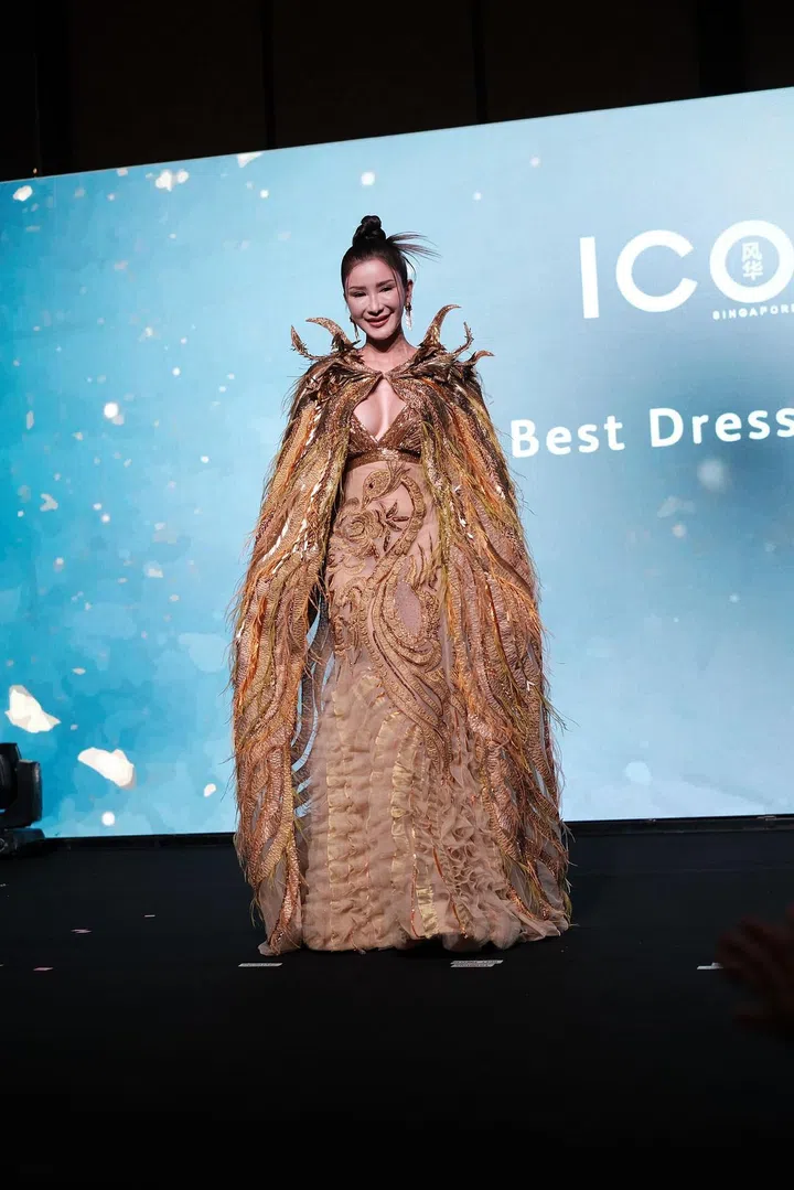 Jamie Chua身着Farah Angsana Couture量身定制的金色晚礼服,一出场便是焦点所在。礼服以低胸设计展露迷人胸型,缀以精妙华美的凤凰图腾细节,闪耀夺目。外搭的金色披风上饰有羽毛细节,一举一动间灵动轻盈,闪闪发光的装饰则塑造如同火焰般的立体点缀,让肩部更加饱满,犹如战场上的女王,散发着无与伦比的气场。据Jamie Chua透露, 这套礼服由16位高定工艺师花了10天的时间于巴黎制造。