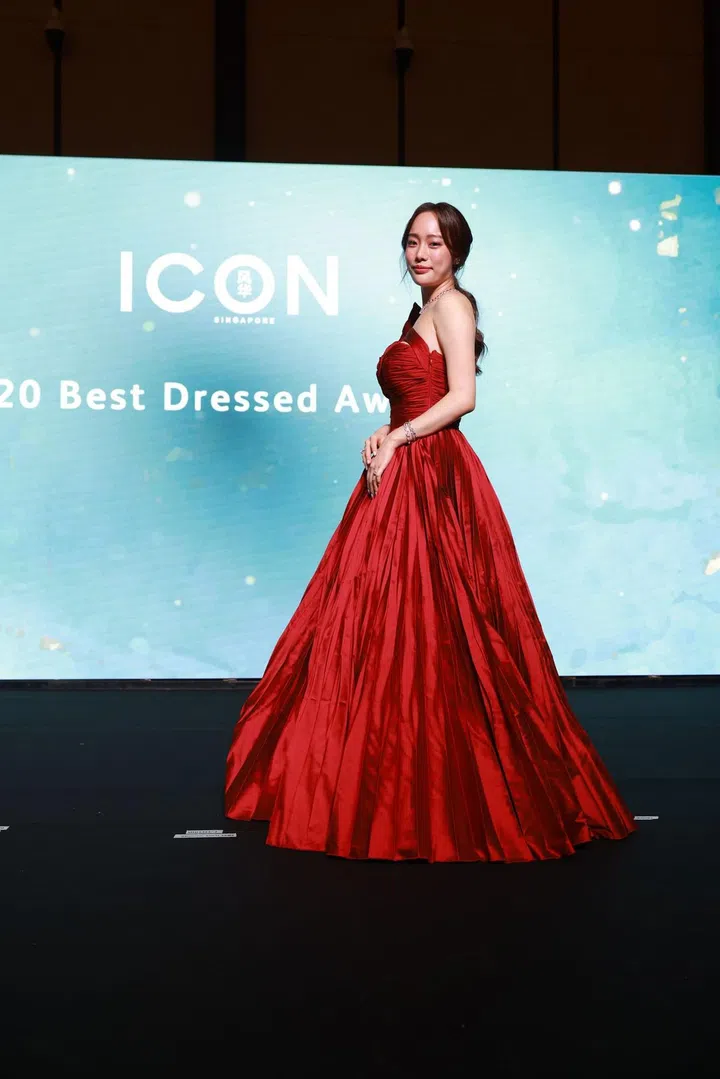 在东方文化中,红色象征着吉祥和喜庆。Zanelle Lim特别挑选了一件由Stylelease提供的Tarik Ediz晚礼服,以深红色为主色调,在光线下闪耀出液体般的流动光泽。裙身剪裁简洁柔美,采用光面百褶裙摆,上身点缀着蝴蝶细节,不仅平添了高贵气质,还展现和放大女性阴柔之美。