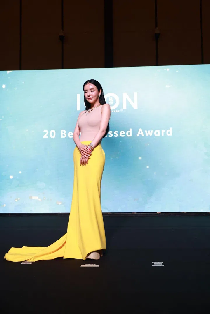 简单就是美。特地从伦敦返回狮城出席晚宴的Kim Lim,以一袭简介大方的Valentino晚礼服,佩戴宝格丽(Bulgari)高级珠宝亮相。上身采用裸色紧身设计,配上鲜艳的黄色裙摆,整体呈现流线型轮廓,线条流畅,展现出女性优美的身材曲线。黄色在中国传统色彩文化中居于崇高的地位,有着高贵、吉祥的文化含义。