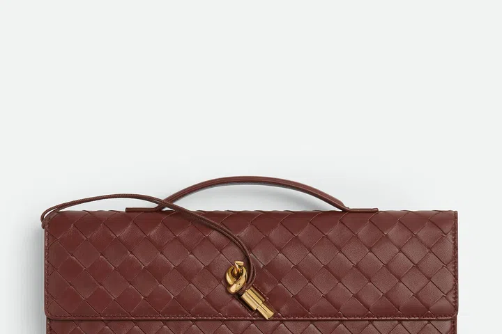 这款Bottega Veneta Andiamo手拿包是典雅与质感的极致体现,深酒红色调搭配品牌标志性Intrecciato编织皮革工艺,低调中散发高级气息。修长的包型轮廓修饰手部线条,自带一份摩登气场,金属锁饰点缀其上,精致之中透出力量感。