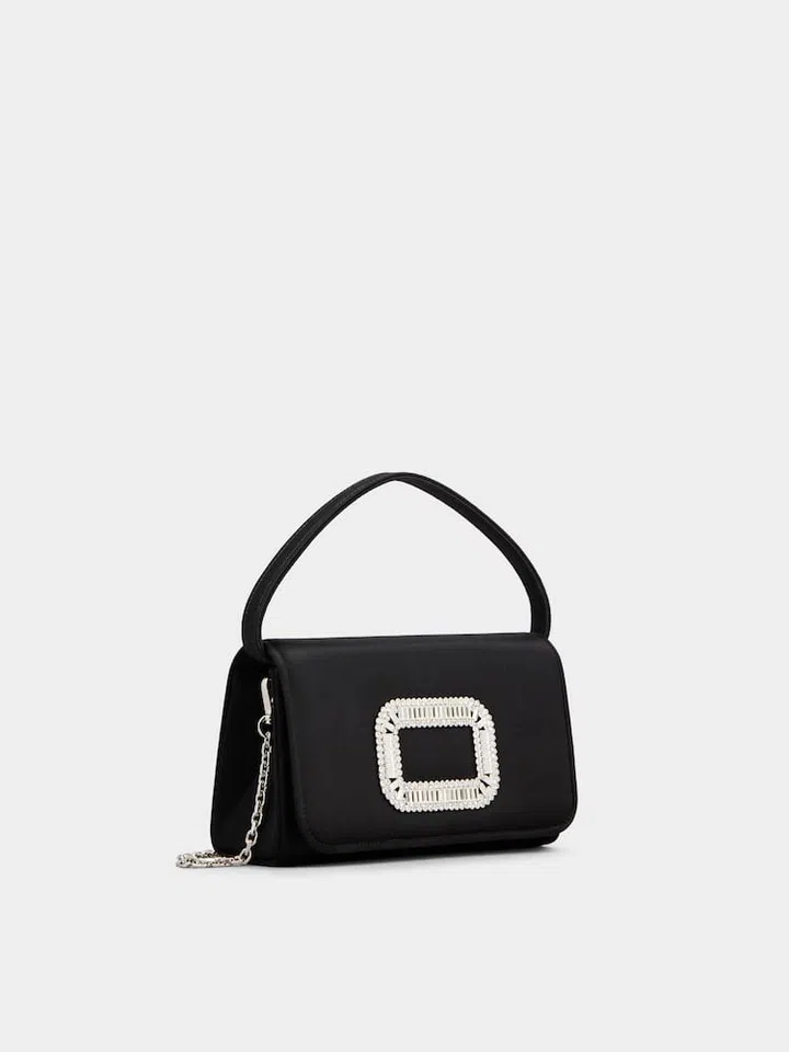 Roger Vivier经典Pilgrim饰扣以高级珠宝镶嵌工艺手工镶嵌方形闪钻,闪耀着璀璨光芒。本款超小号手袋以丝缎制成,配以可拆卸链条肩带,无论是日间聚会还是夜晚盛宴,皆可展现从容优雅的风格。
