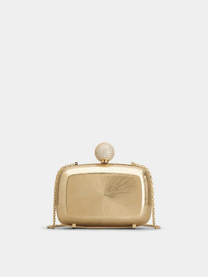 Roger Vivier Boite de Nuit金属手拿包,呈现高光金属质感,简约却不失奢华。引人注目的是球形包口搭扣,镶嵌细致水钻,宛如珠宝般璀璨。配有纤细的链条肩带,既可手拿亦可肩背,适合晚宴、派对等正式场合,为夜间造型增添温柔气质。