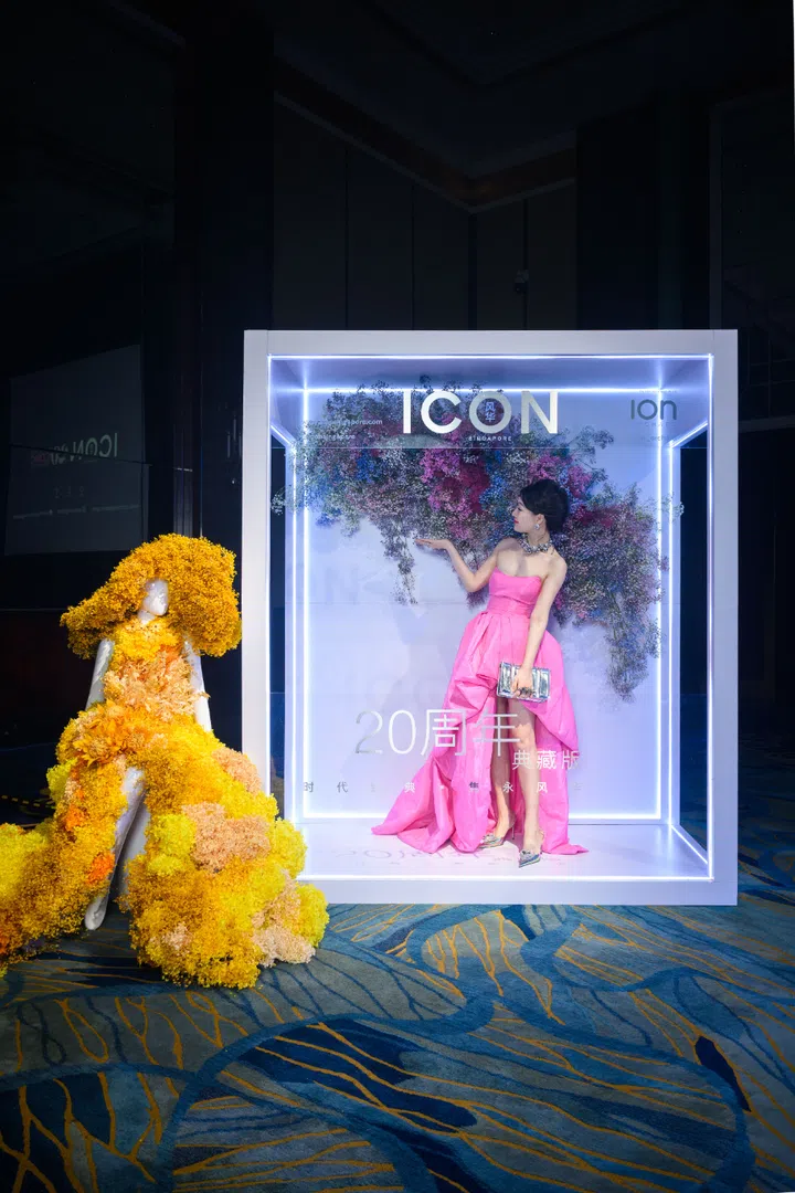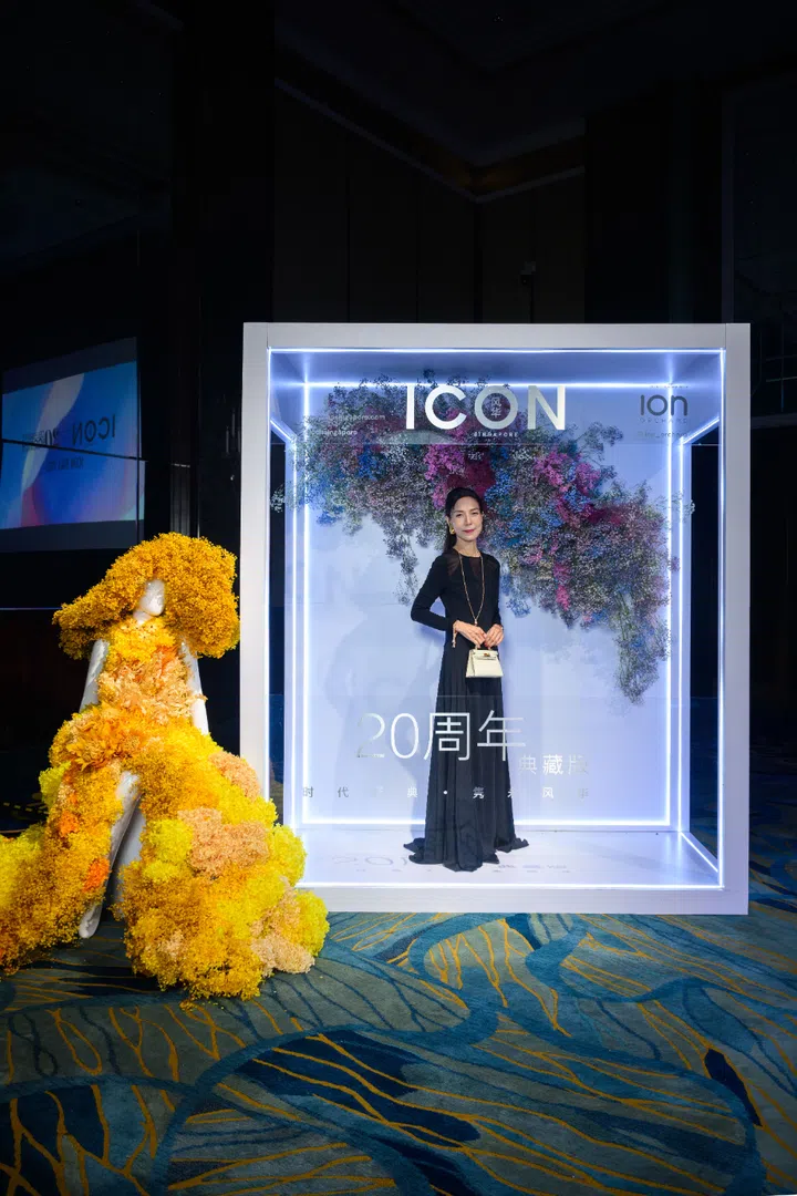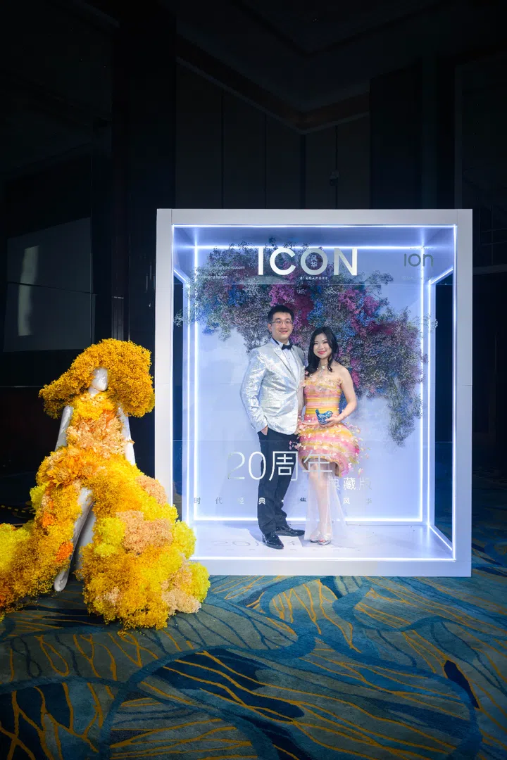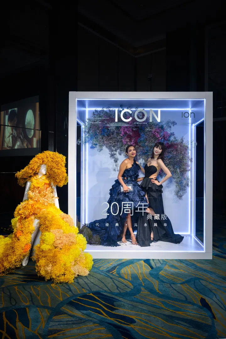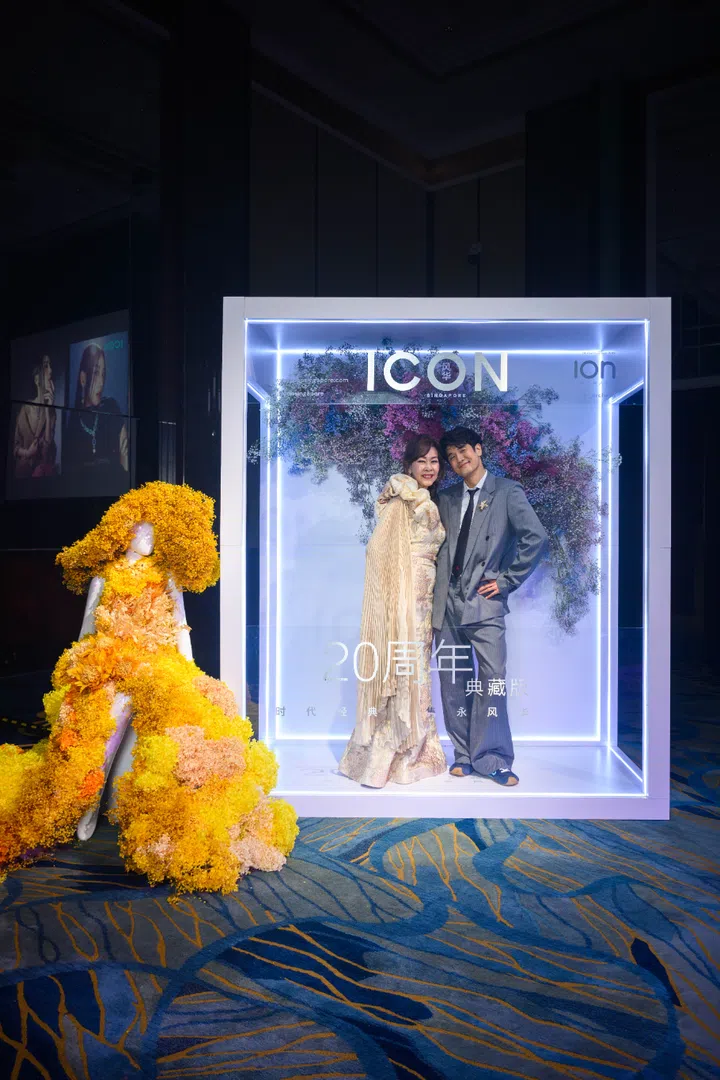 《风华》杂志20周年晚宴携手合作品牌于新加坡香格里拉大酒店宴会厅内精心设置多组拍照厅。其中,官方奢华购物商场合作伙伴ION Orchard打造的专属拍照区,再度呈现“ICONIC COUTURE:The Art of Timeless Elegance”展览中的经典装置。拍照厅以《风华》20周年封面造型为灵感,点缀Fiore Dorato的精致花艺,宾客们纷纷驻足留影,定格专属于这一夜的风华瞬间。