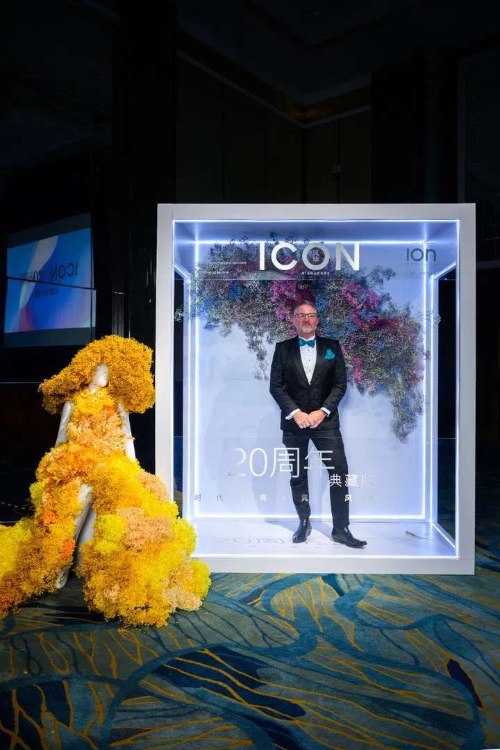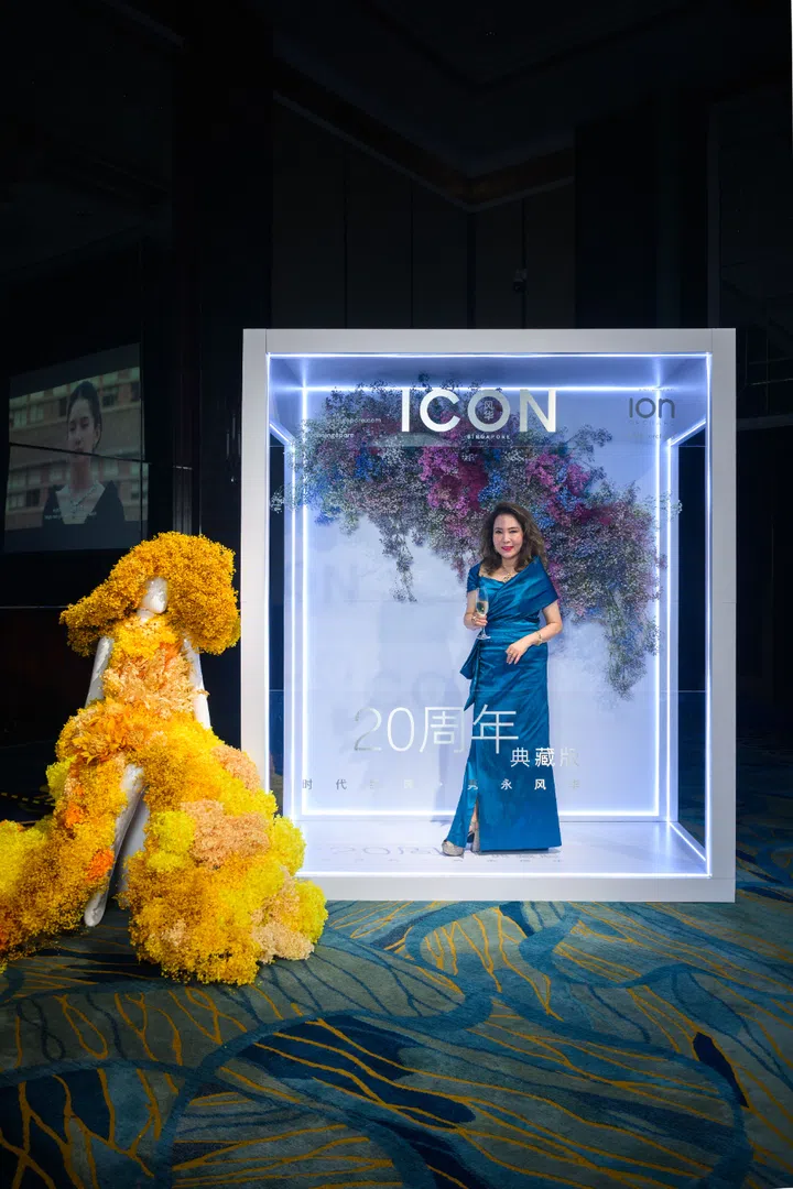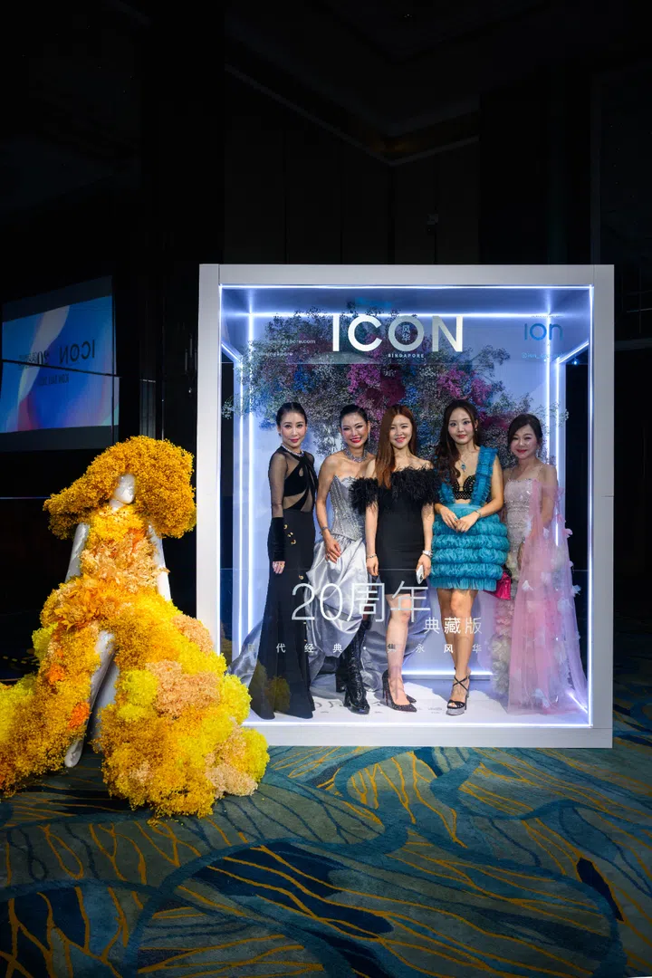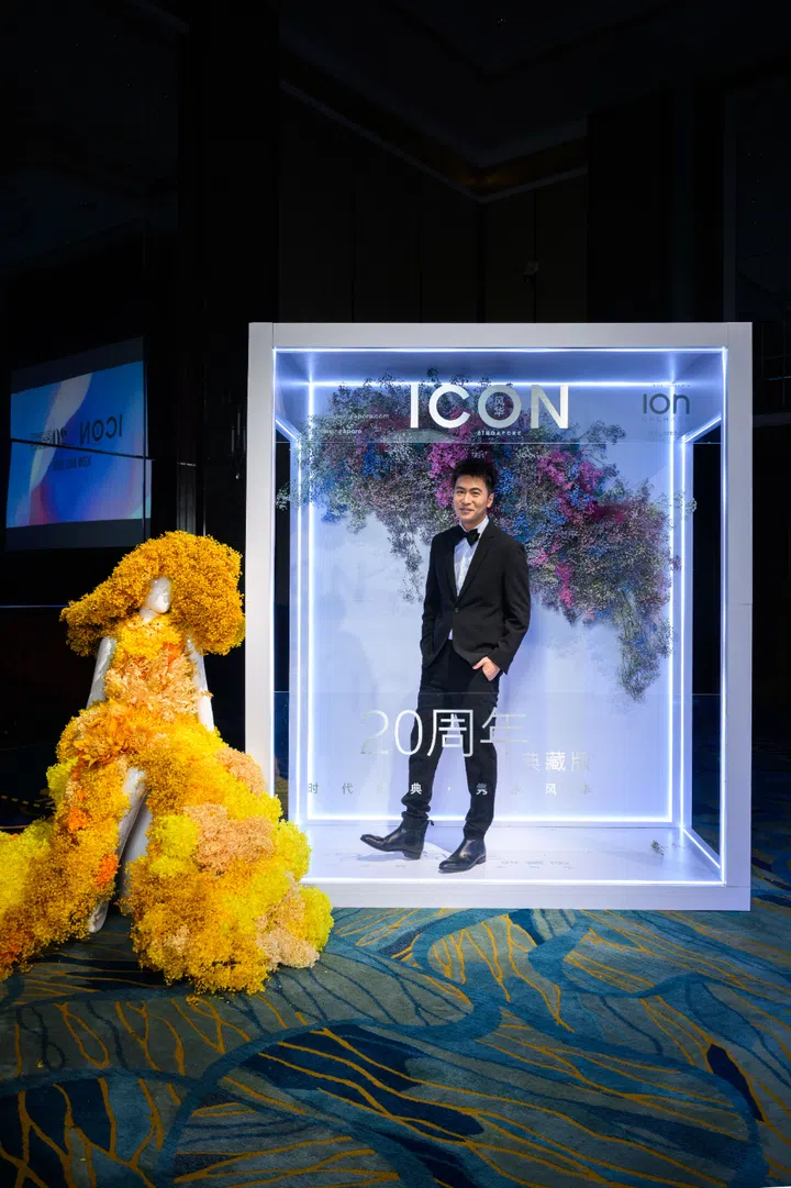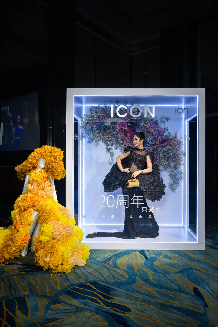 《风华》杂志20周年晚宴携手合作品牌于新加坡香格里拉大酒店宴会厅内精心设置多组拍照厅。其中,官方奢华购物商场合作伙伴ION Orchard打造的专属拍照区,再度呈现“ICONIC COUTURE:The Art of Timeless Elegance”展览中的经典装置。拍照厅以《风华》20周年封面造型为灵感,点缀Fiore Dorato的精致花艺,宾客们纷纷驻足留影,定格专属于这一夜的风华瞬间。